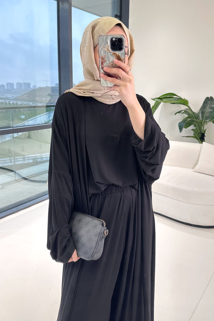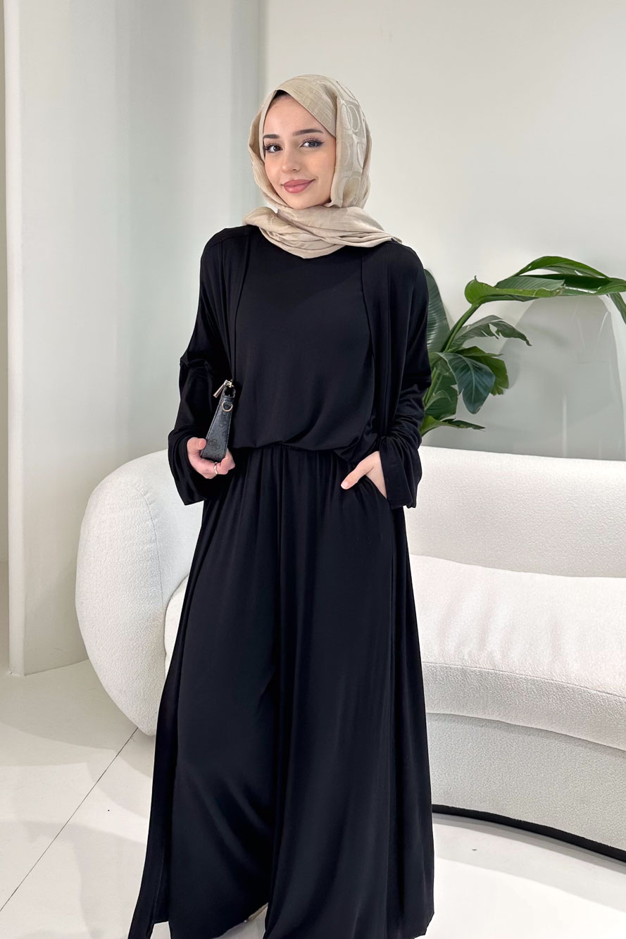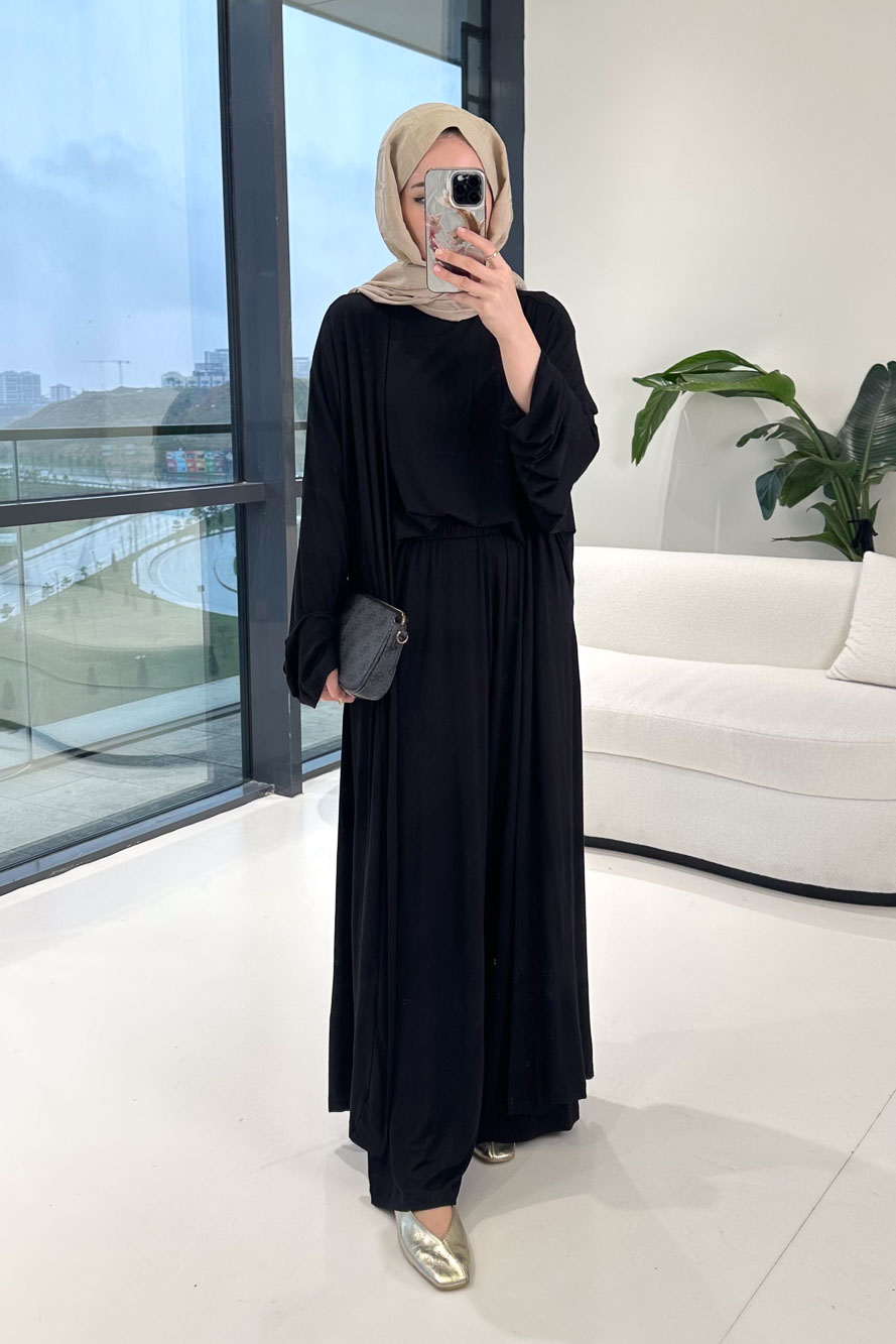 Takım; uzun üst, pantolon ve içlikten oluşur. Üst parça yan yırtmaç detayı ile hareket kazandırırken, içlik ile kombin tamamlanır. Pantolonun beli tam lastiklidir ve rahat bir kullanım sağlar. Cepli yapısı ile fonksiyonellik sunar. Manken üzerinde SM bedendir.