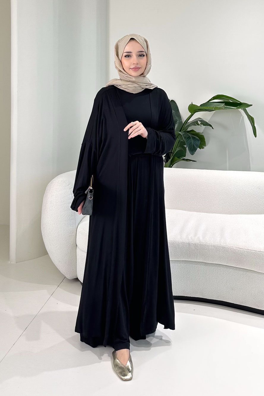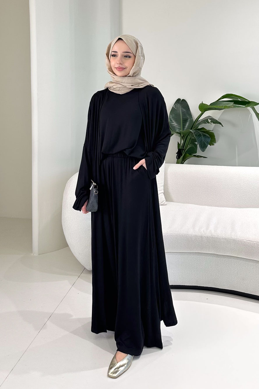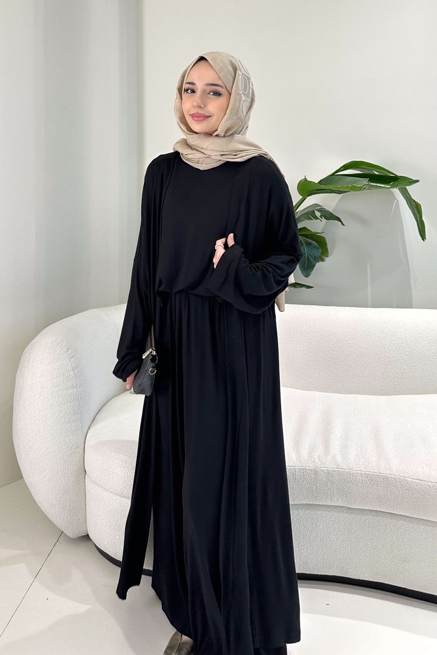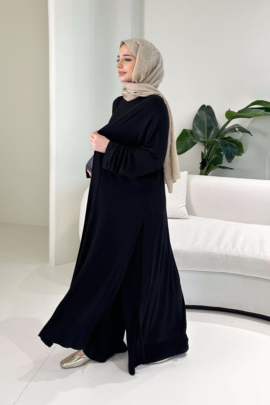 Takım; uzun üst, pantolon ve içlikten oluşur. Üst parça yan yırtmaç detayı ile hareket kazandırırken, içlik ile kombin tamamlanır. Pantolonun beli tam lastiklidir ve rahat bir kullanım sağlar. Cepli yapısı ile fonksiyonellik sunar. Manken üzerinde SM bedendir.