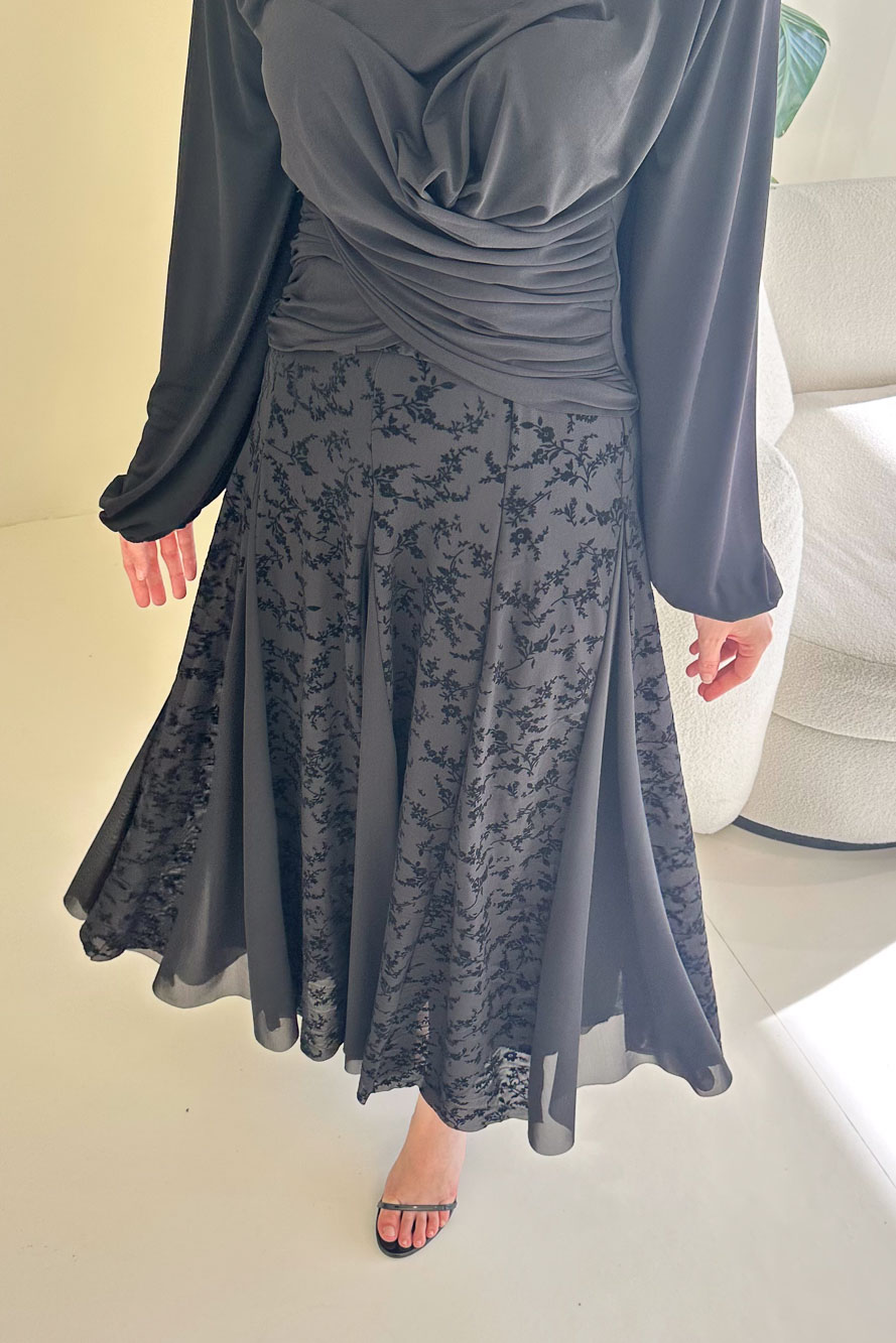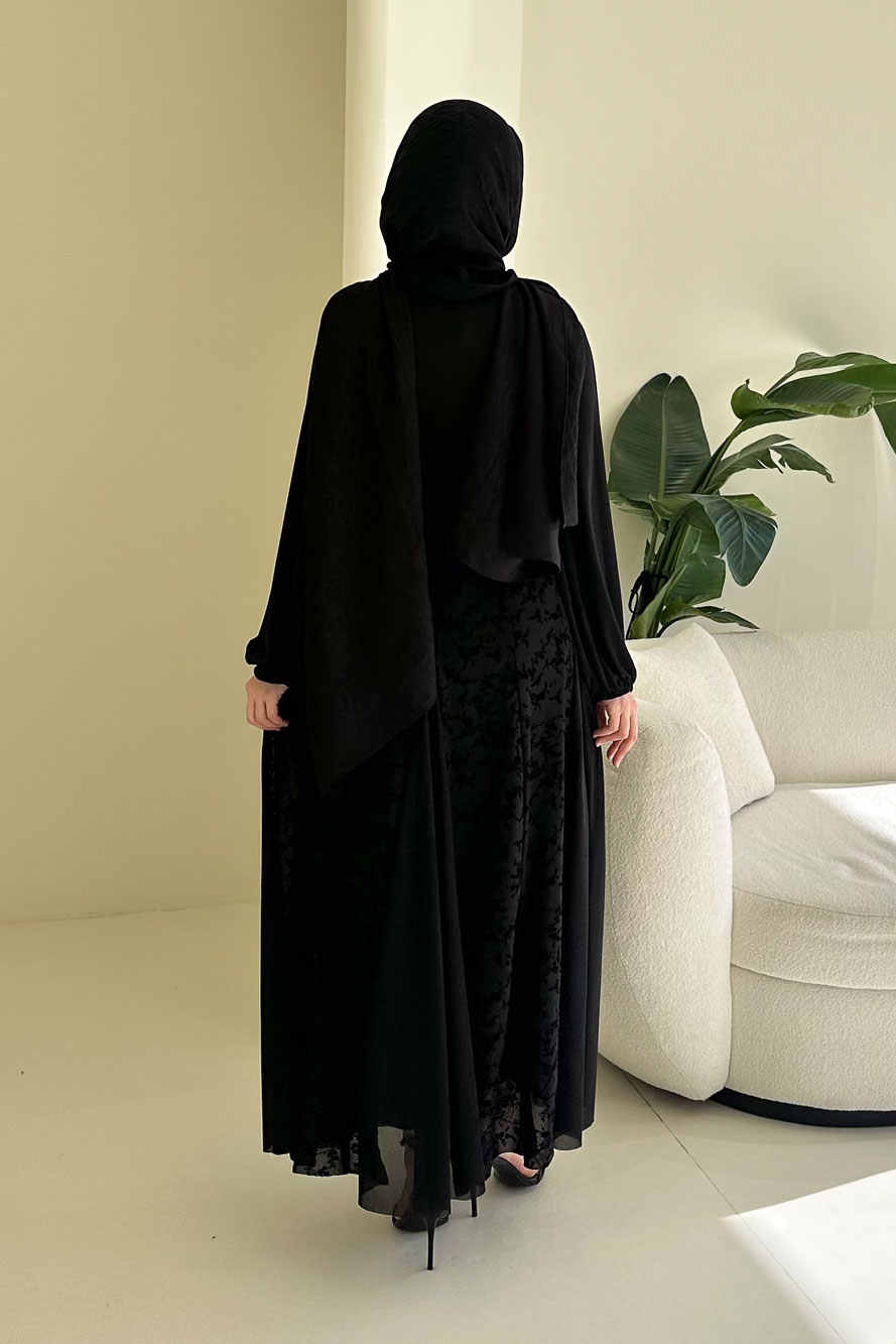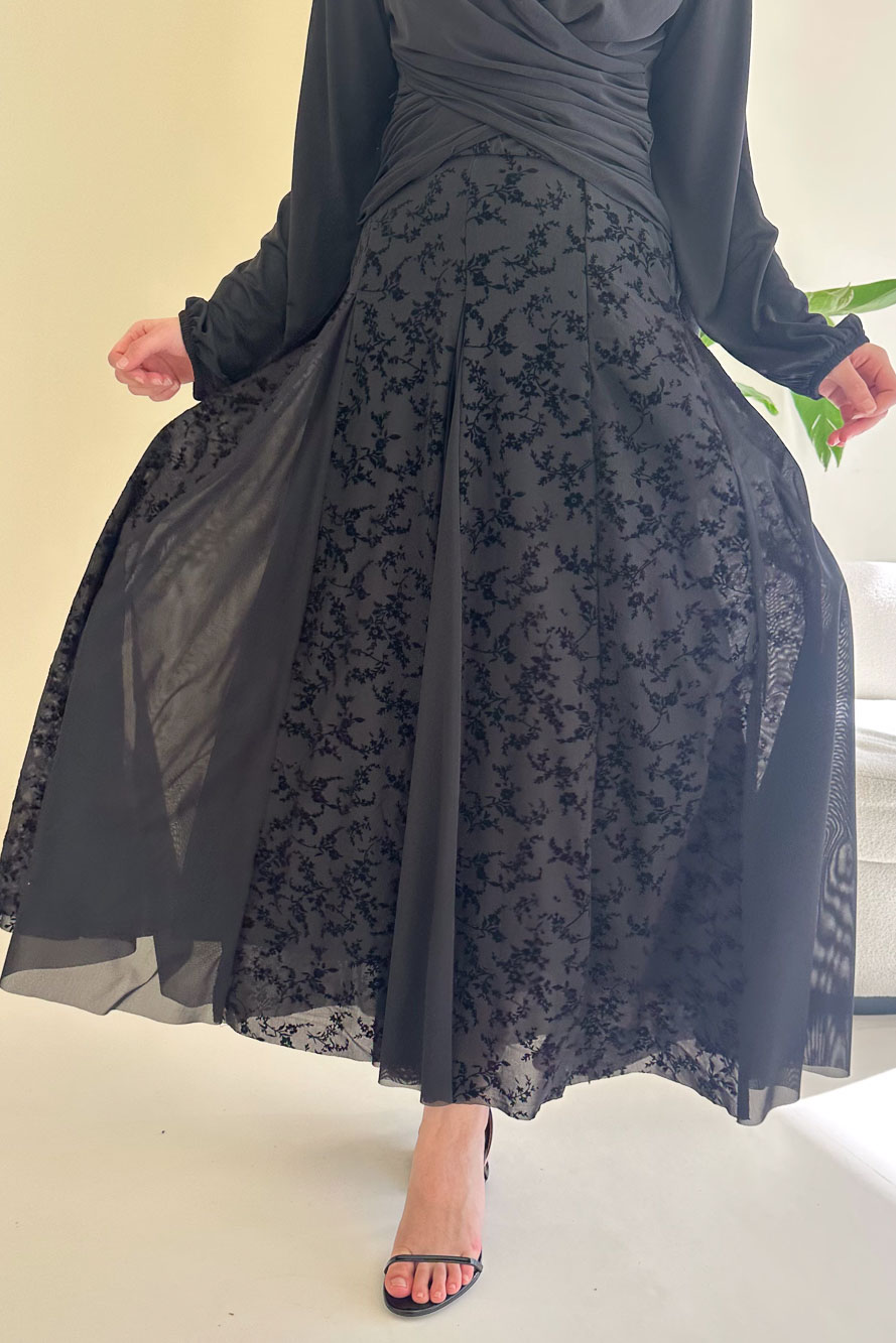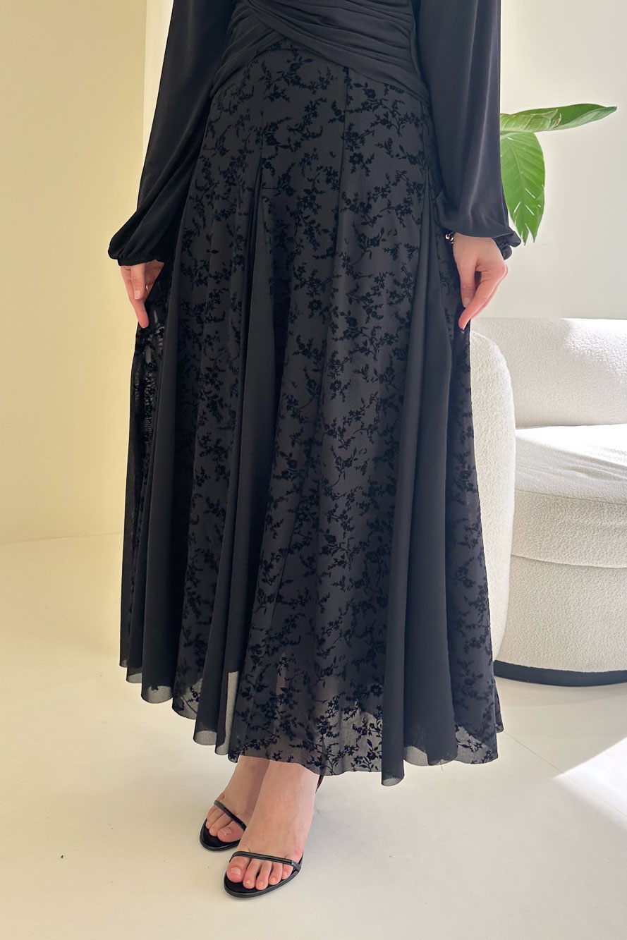 Zarif flok baskı detayları ve hafif dokulu şifon kumaşıyla tasarlanan bu özel takım, akışkan ve feminen bir siluet sunar.