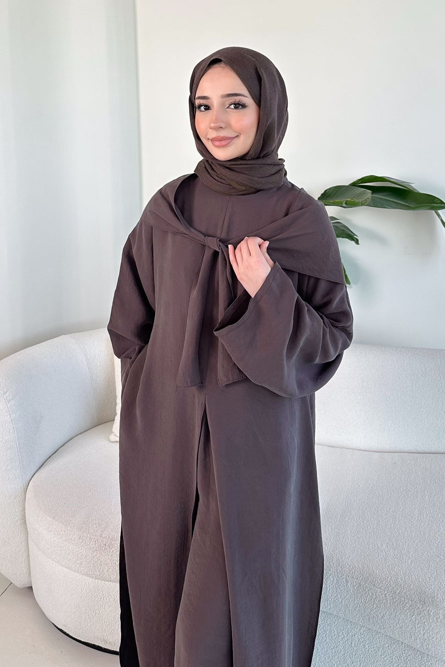 Uzun form üst tasarımı yan ve ön yırtmaç detayları ile hareket kazanırken, fular detayı ile sofistike bir stil oluşturur. Pantolonun tam lastikli beli rahatlık sağlarken, cepli yapısı kullanım kolaylığı sunar. Günlük şıklıktan özel kombinlere kadar geniş bir kullanım alanı sunar.