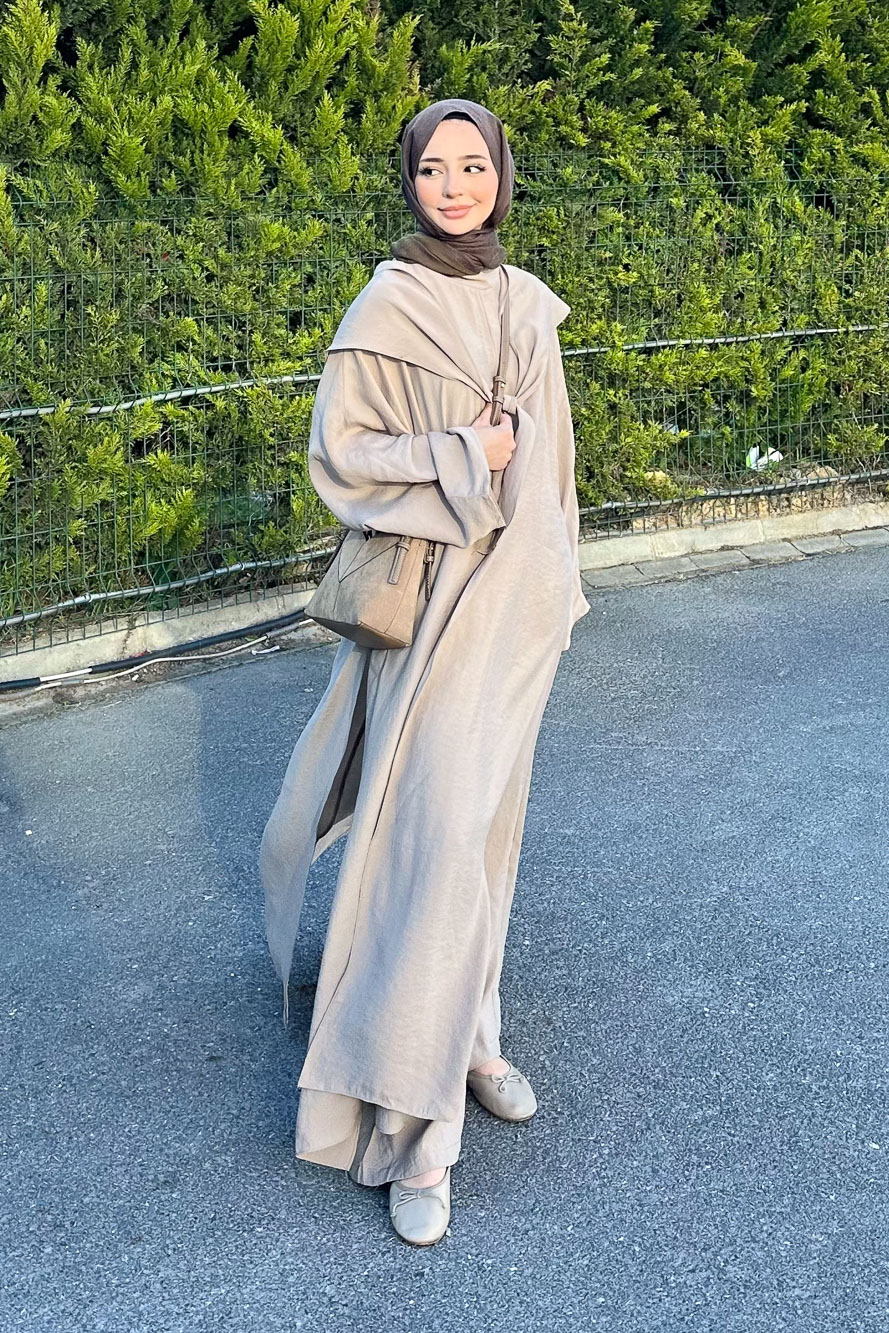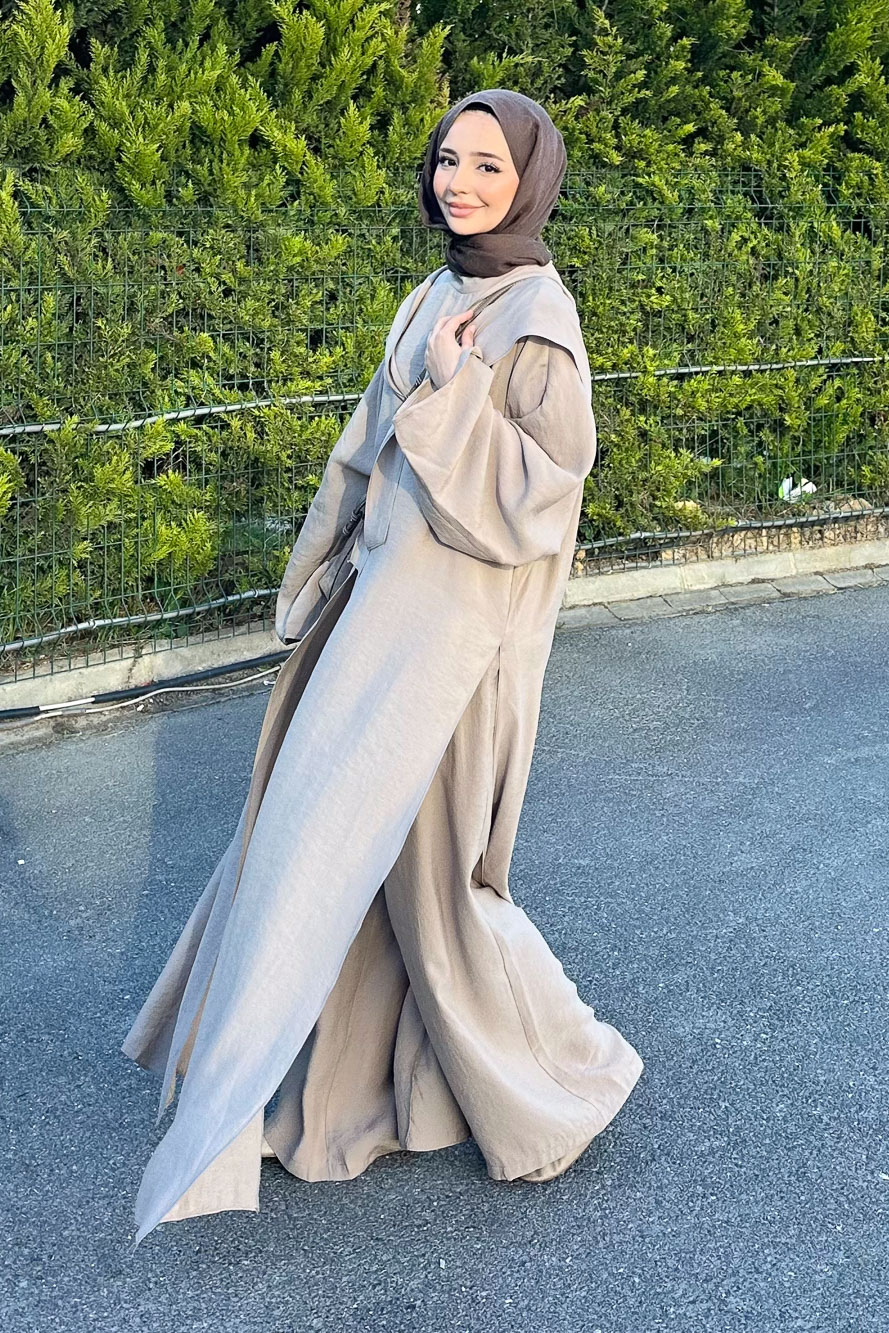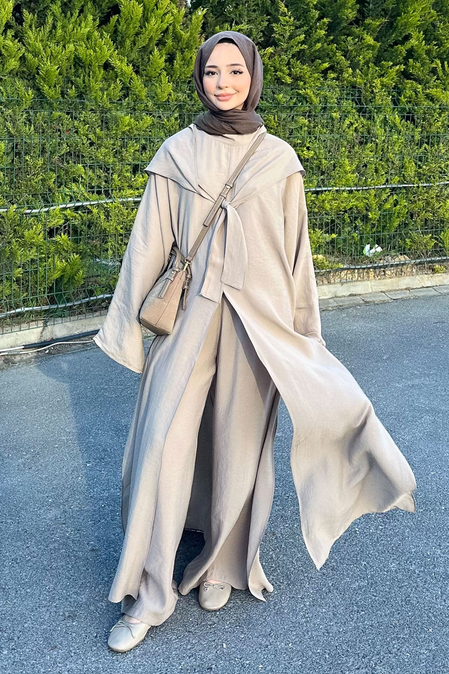 Uzun form üst tasarımı yan ve ön yırtmaç detayları ile hareket kazanırken, fular detayı ile sofistike bir stil oluşturur. Pantolonun tam lastikli beli rahatlık sağlarken, cepli yapısı kullanım kolaylığı sunar. Günlük şıklıktan özel kombinlere kadar geniş bir kullanım alanı sunar.