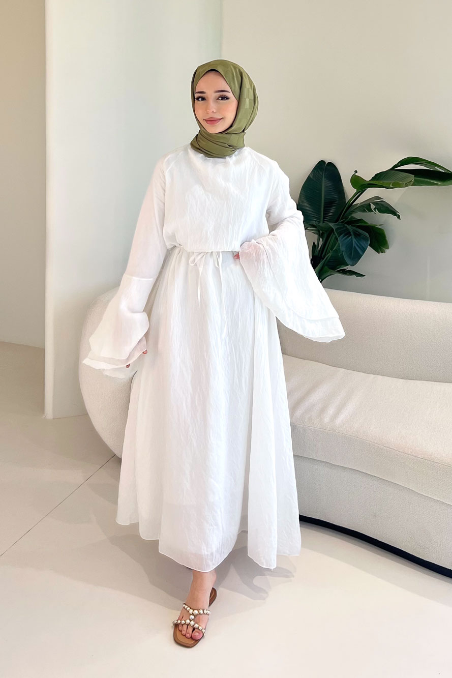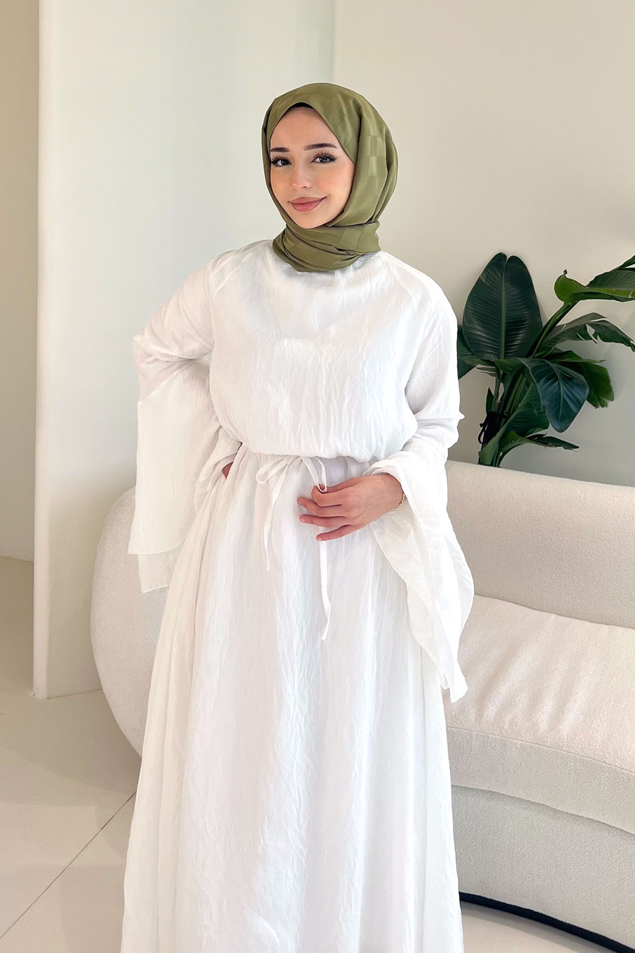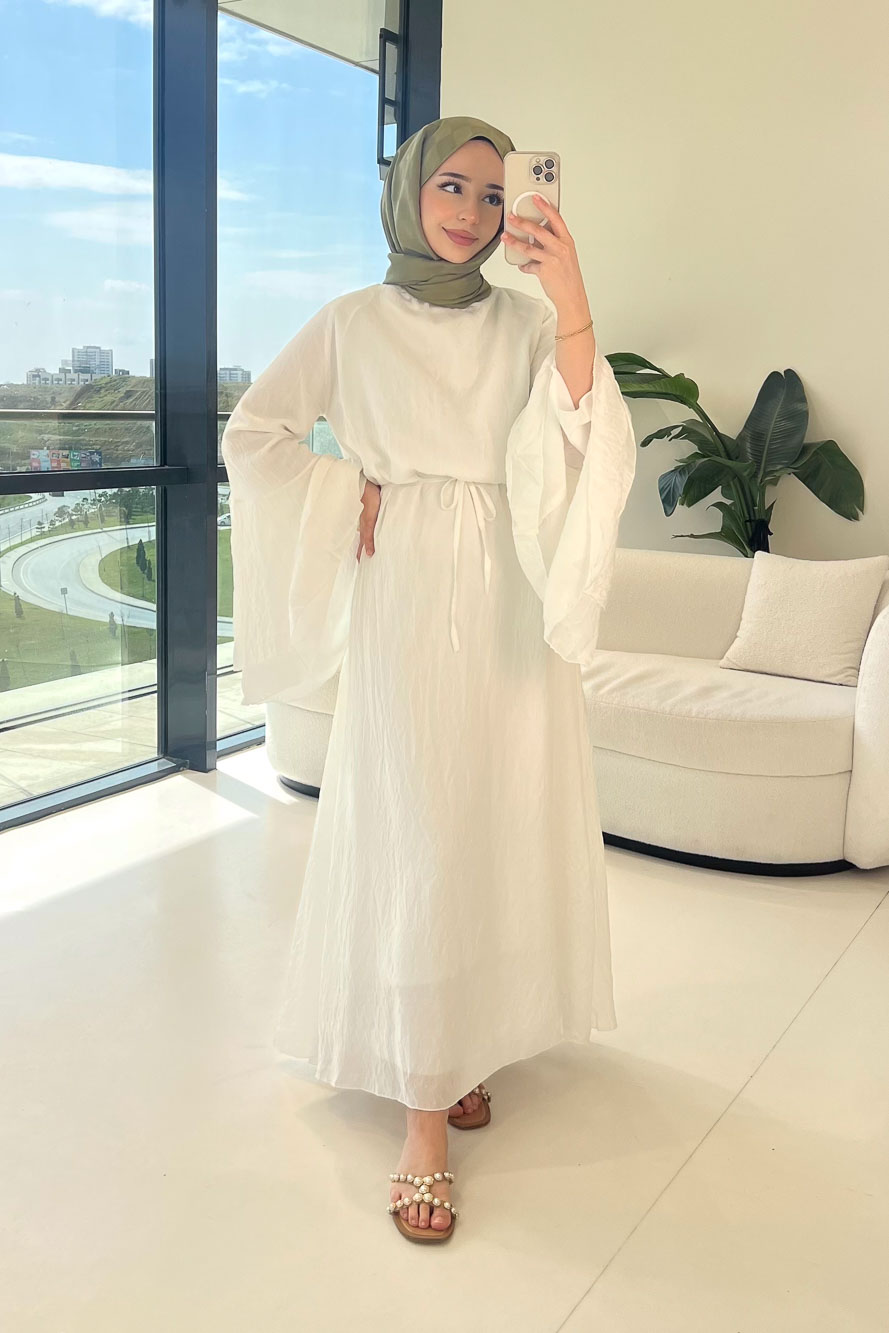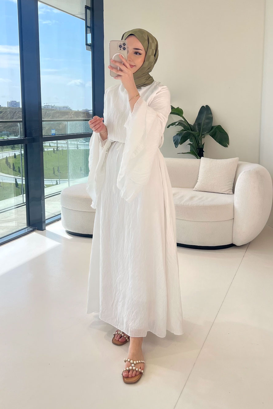 İspanyol kol detayı ile hareketli ve dikkat çekici bir görünüm sağlar. Arkası fermuarlıdır. Tam astarlı yapısı sayesinde iç göstermez. Seyyar kemeri ile bel vurgusu yapılabilir ve şık bir siluet oluşturur. Manken üzerinde SM bedendir.