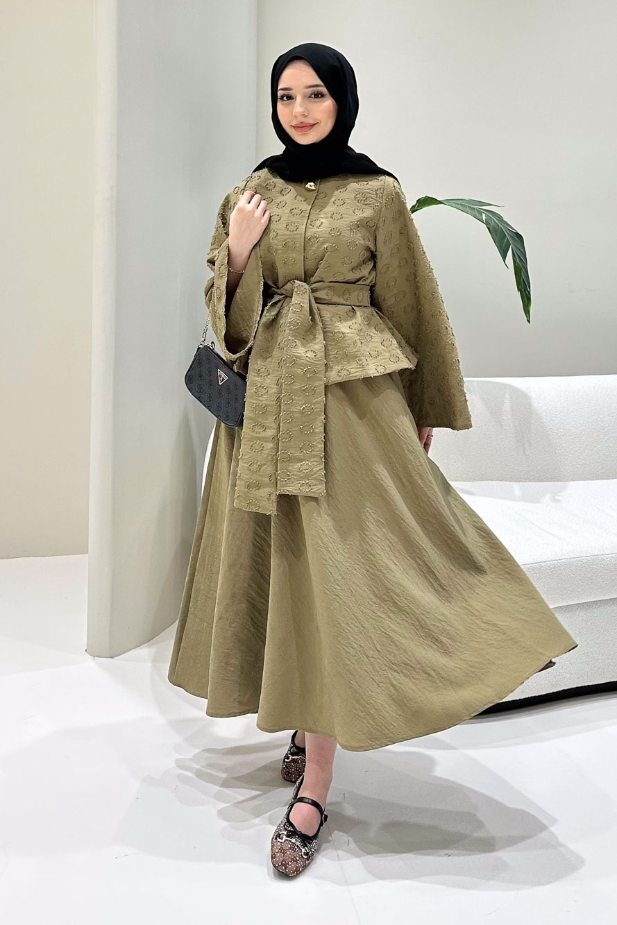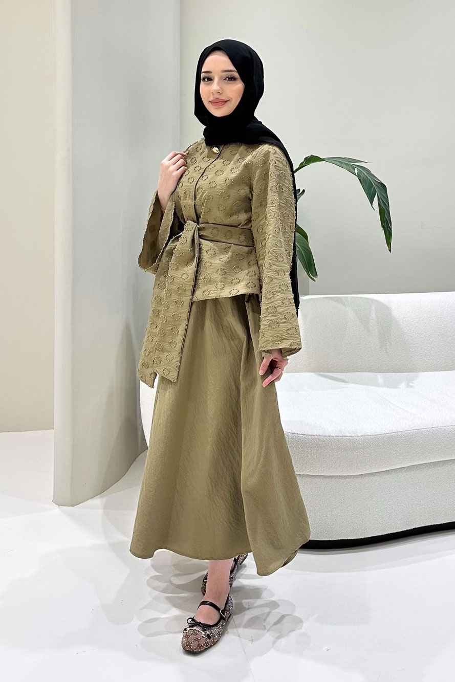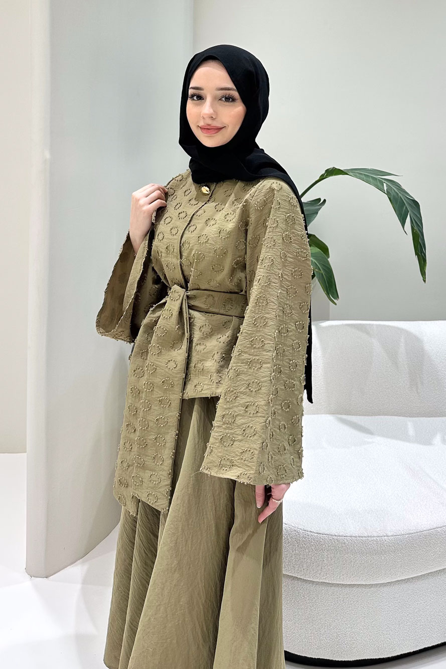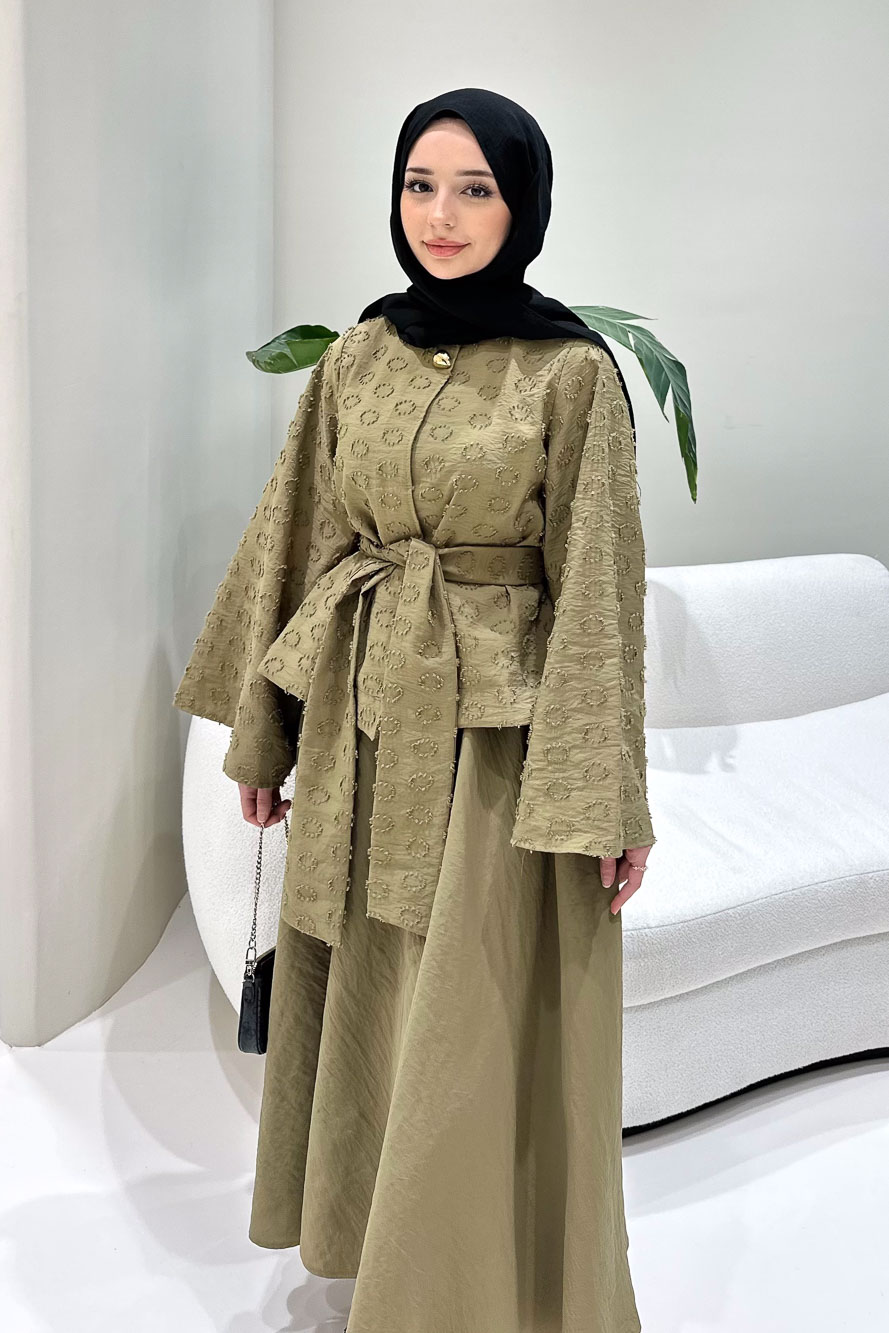 Düz kesim formu ve bağlamalı tasarımıyla sade ama güçlü bir siluet sunar.