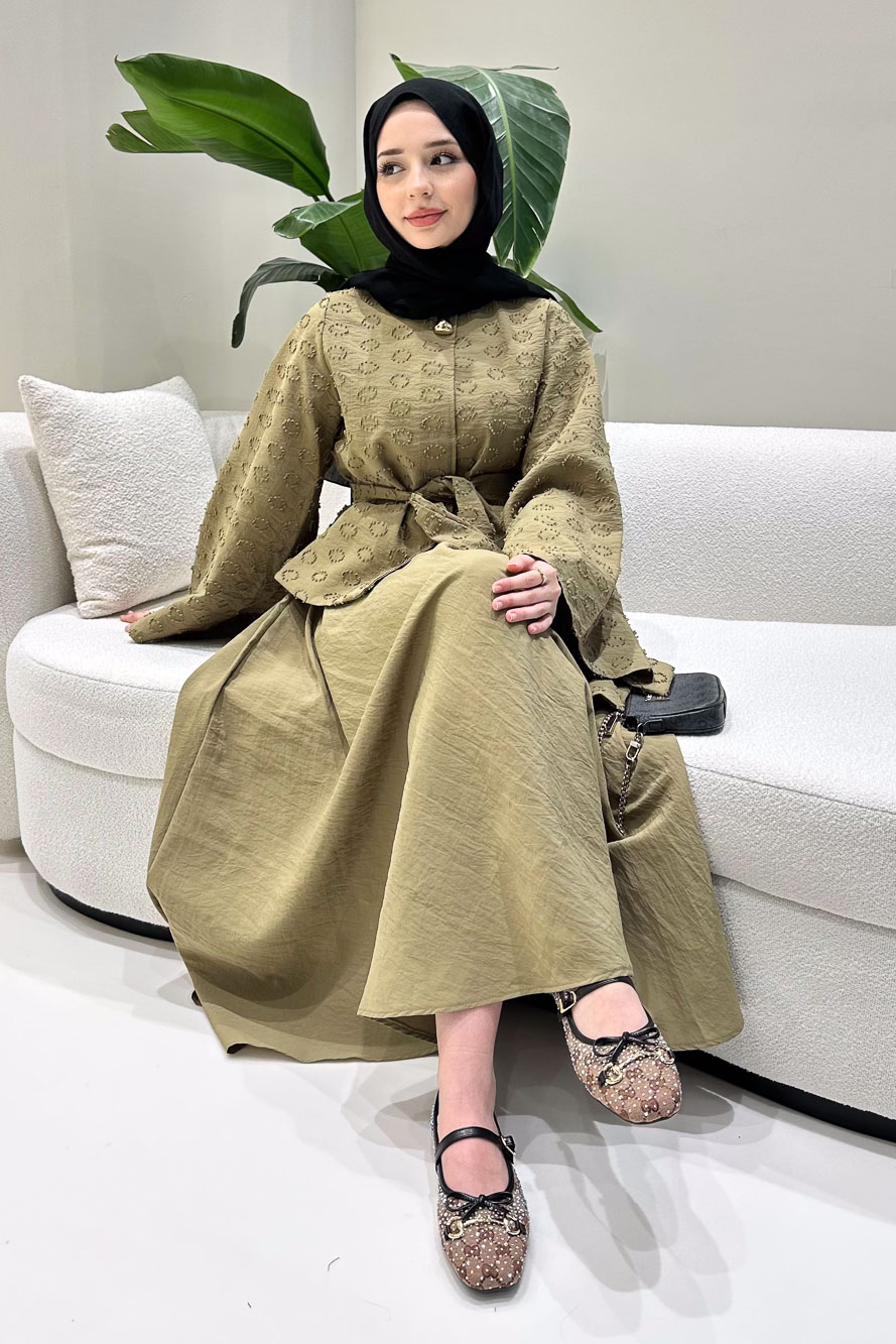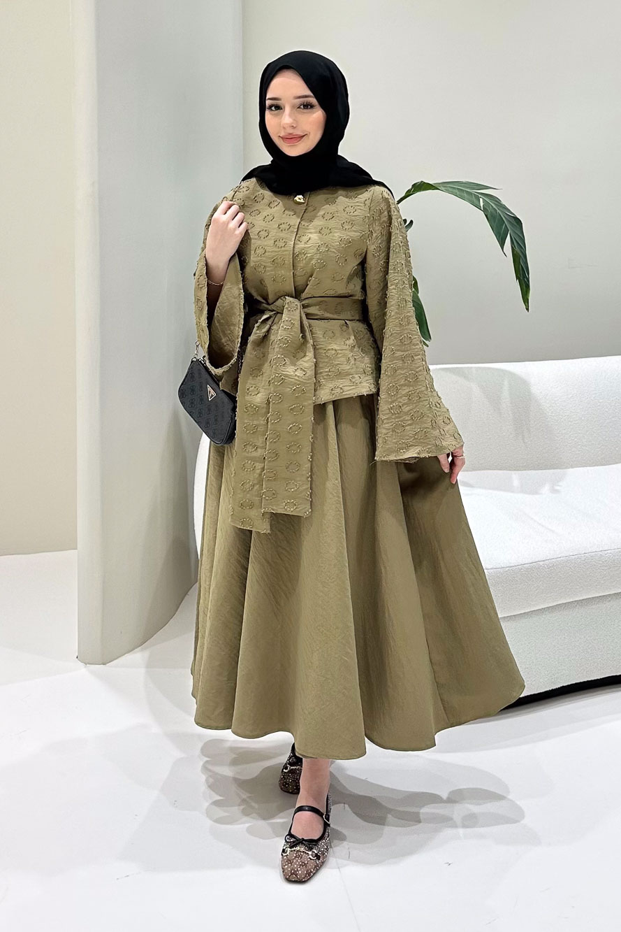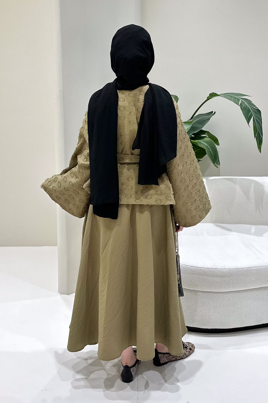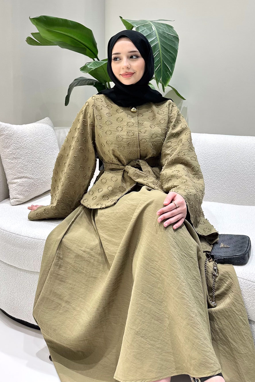 Düz kesim formu ve bağlamalı tasarımıyla sade ama güçlü bir siluet sunar.