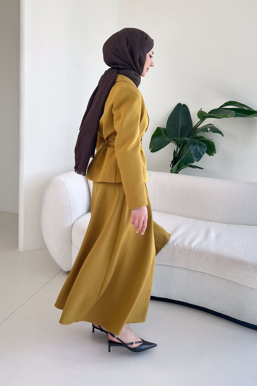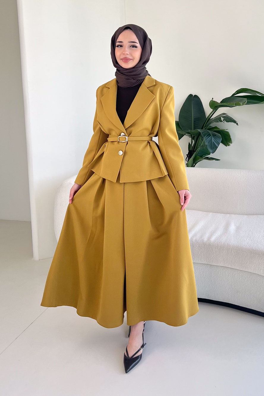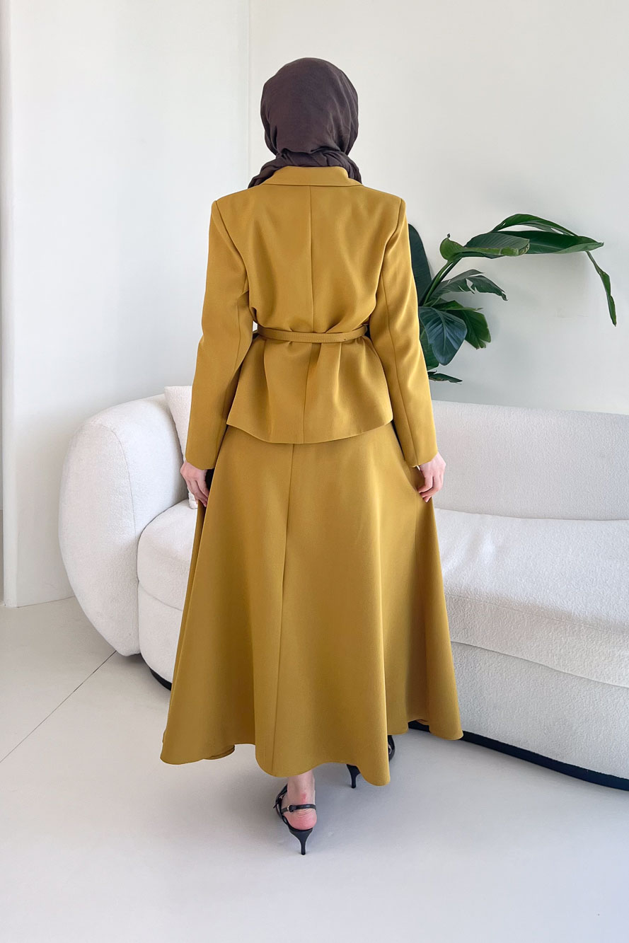 Ceketi astarlıdır ve önden gold düğmelidir. Pile detaylı tasarıma sahiptir. Etek kısmı fermuarlıdır, beli lastiklidir ve önden pilelidir. Kemerli formdadır. Manken üzerinde S bedendir.