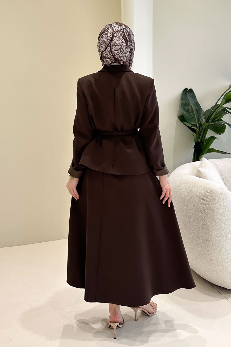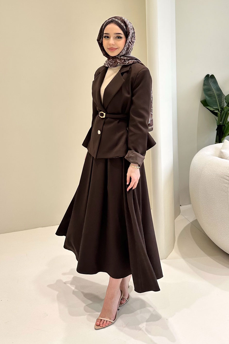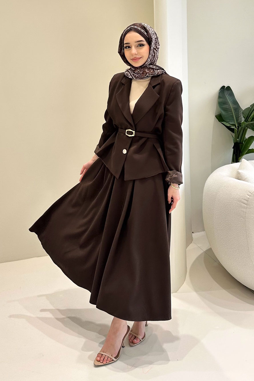 Ceketi astarlıdır ve önden gold düğmelidir. Pile detaylı tasarıma sahiptir. Etek kısmı fermuarlıdır, beli lastiklidir ve önden pilelidir. Kemerli formdadır. Manken üzerinde S bedendir.