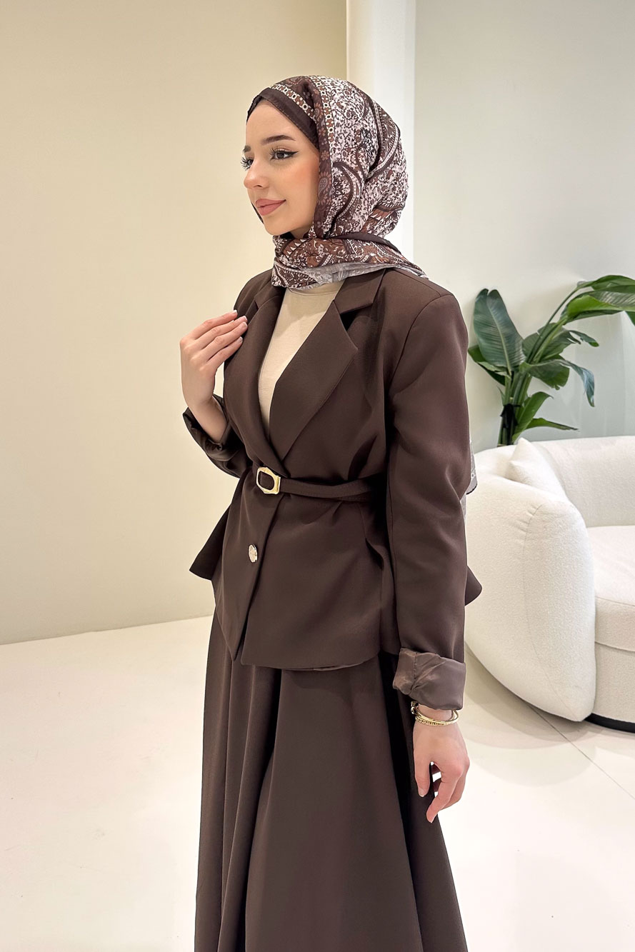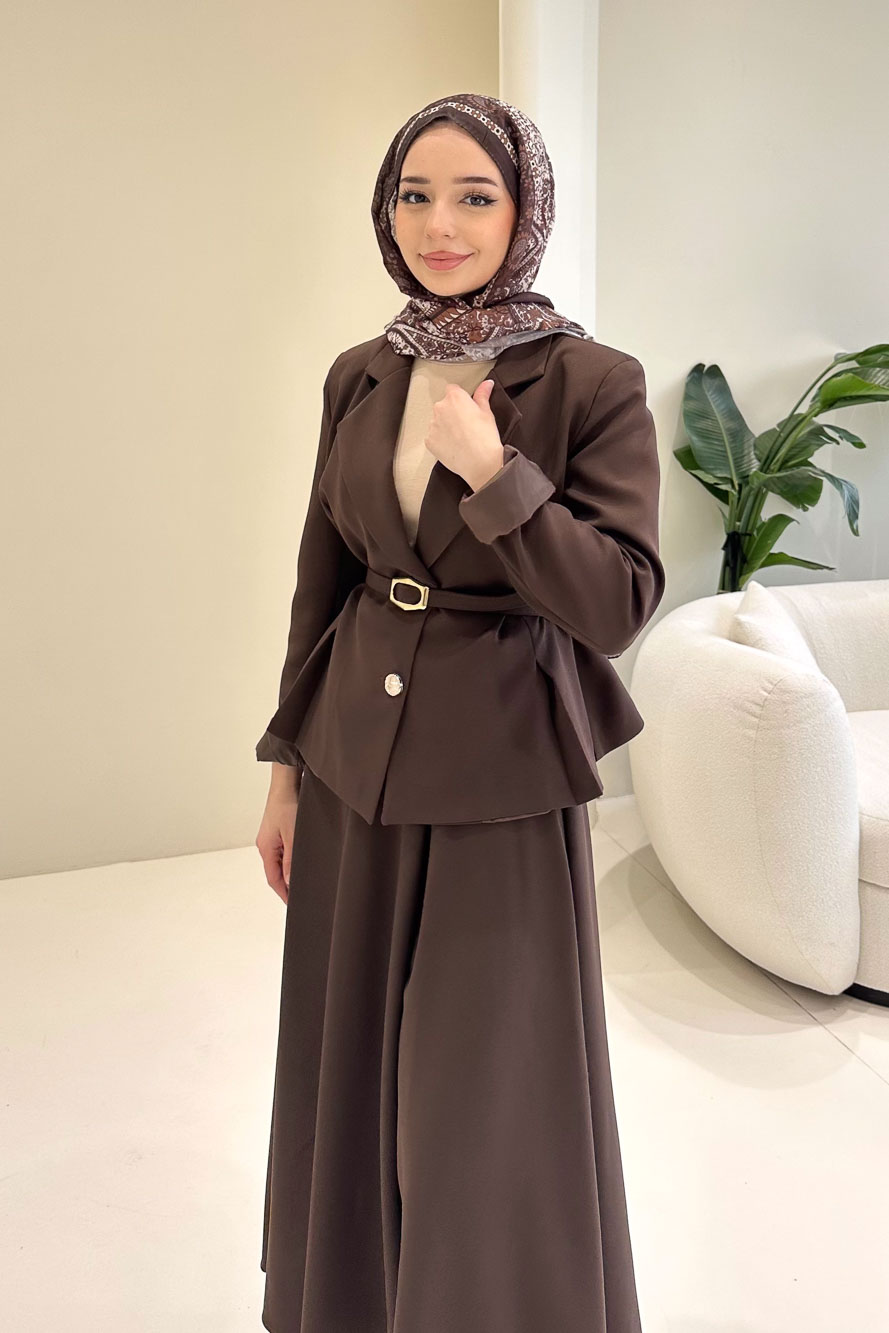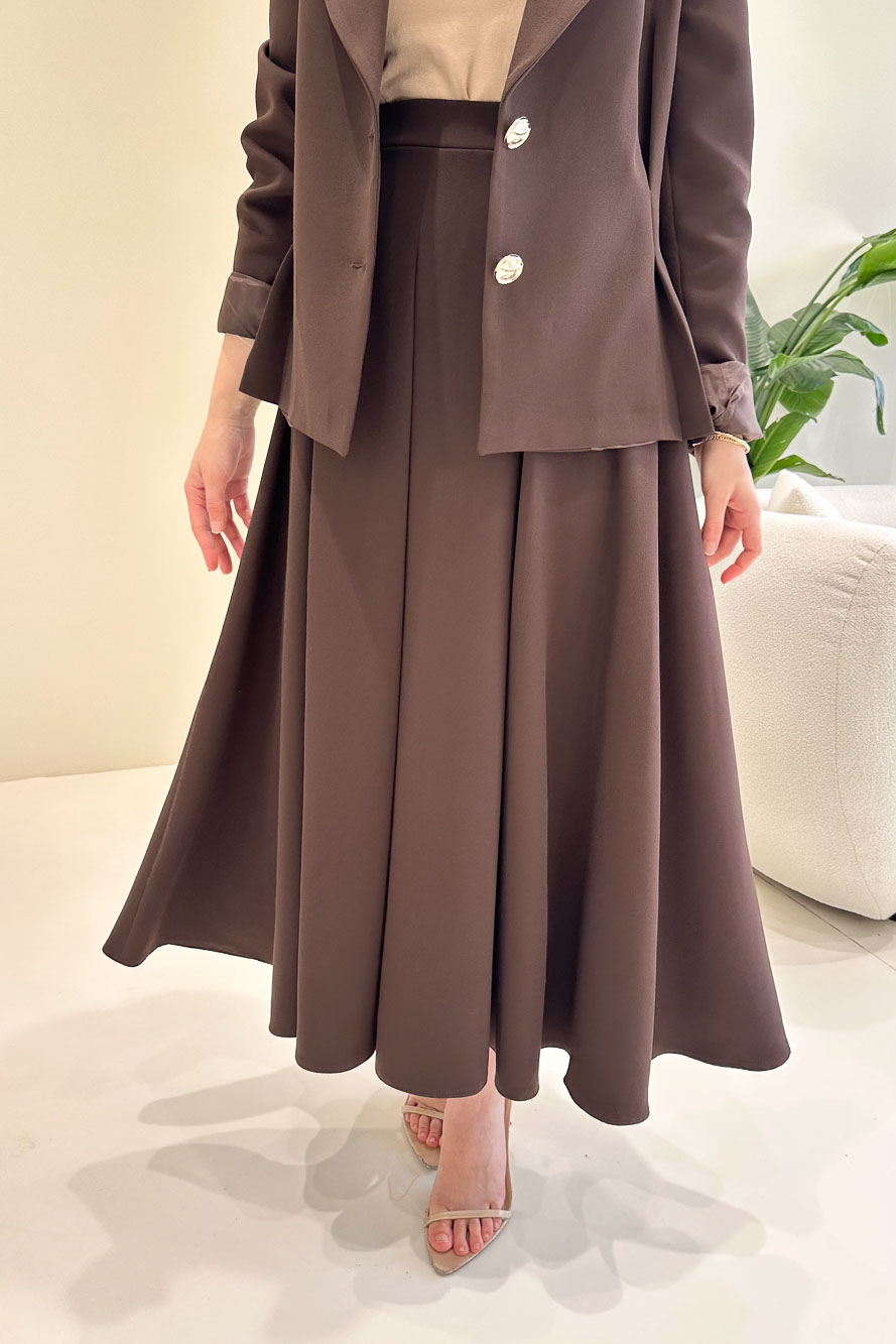 Ceketi astarlıdır ve önden gold düğmelidir. Pile detaylı tasarıma sahiptir. Etek kısmı fermuarlıdır, beli lastiklidir ve önden pilelidir. Kemerli formdadır. Manken üzerinde S bedendir.
