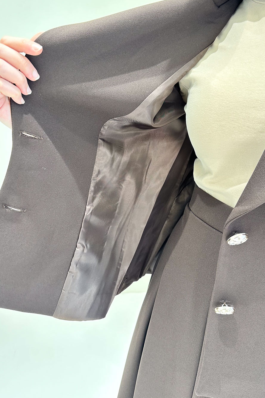 Zarif kesimi ve gold düğme detaylarıyla şık ve güçlü bir stil sunar.