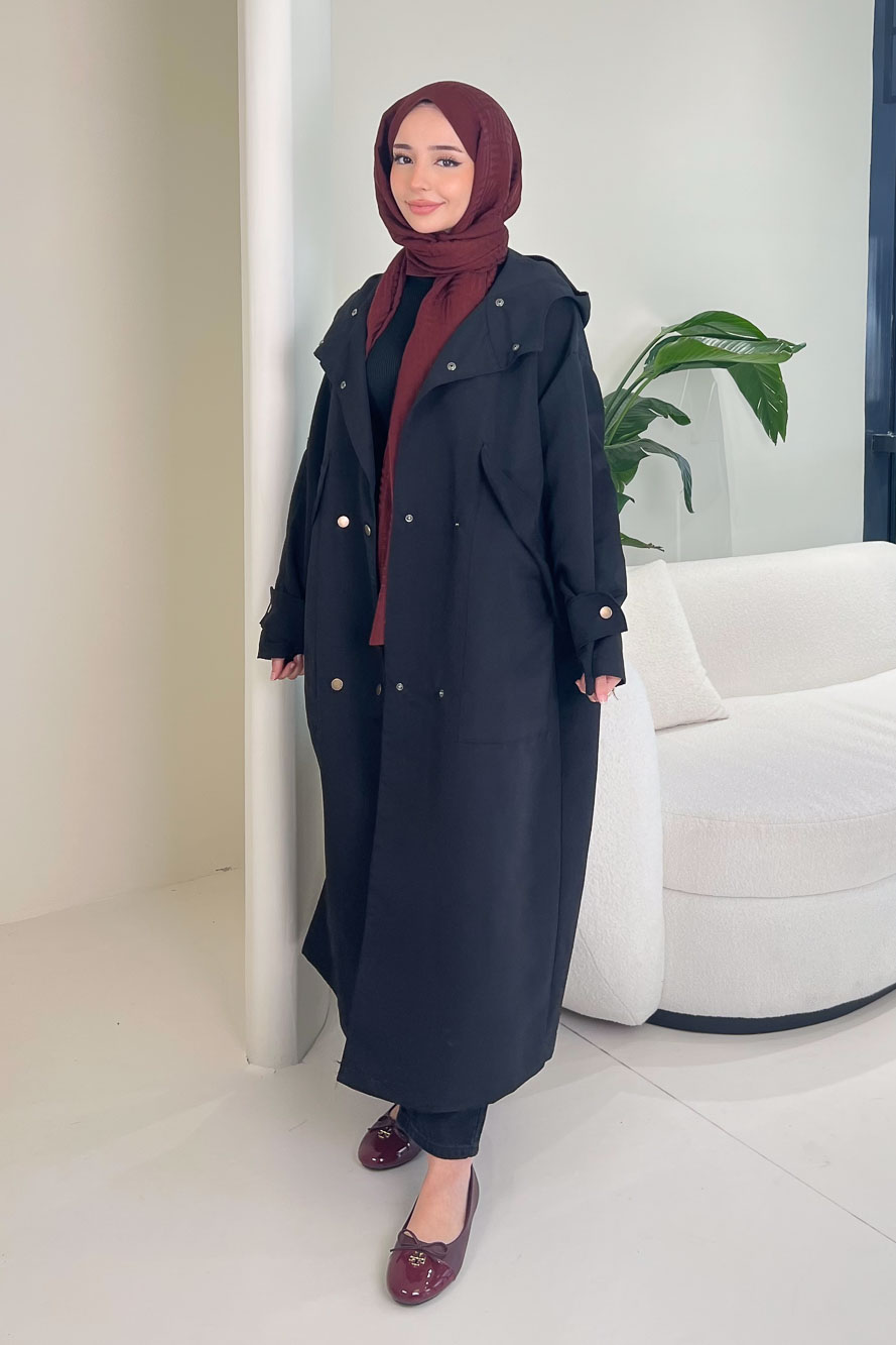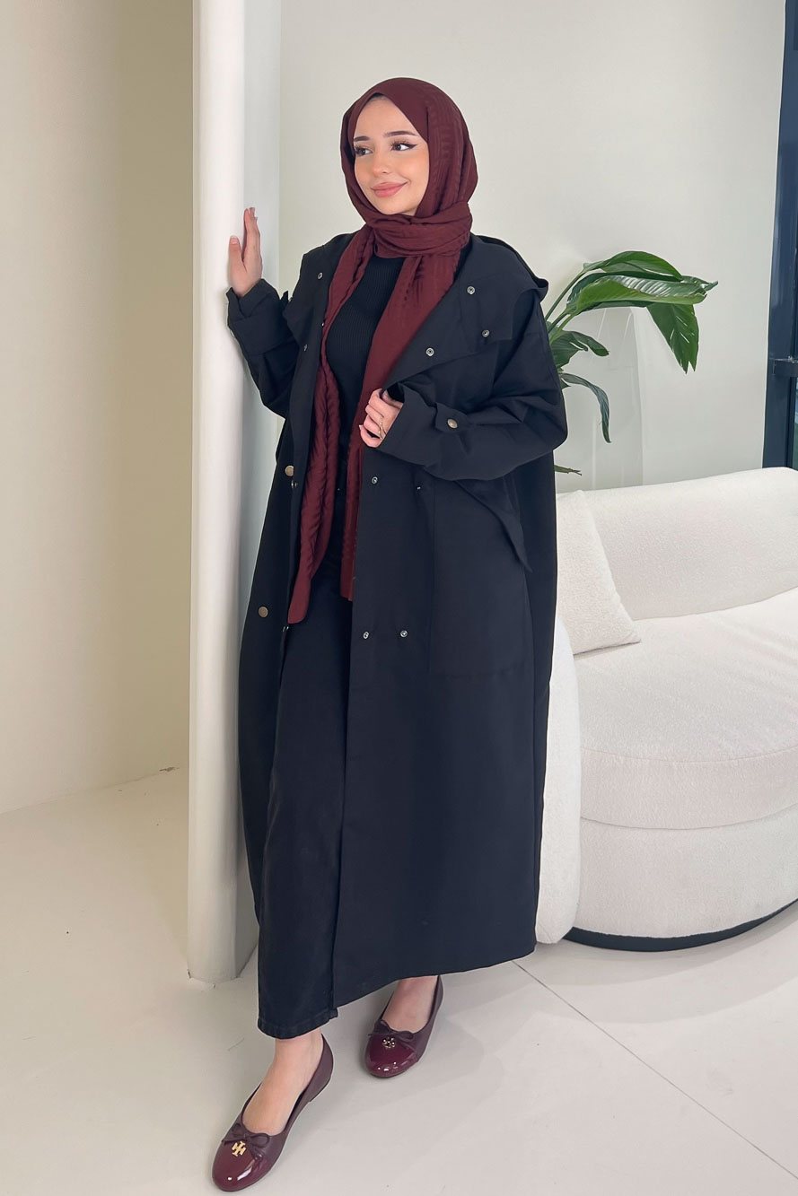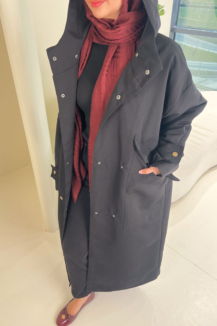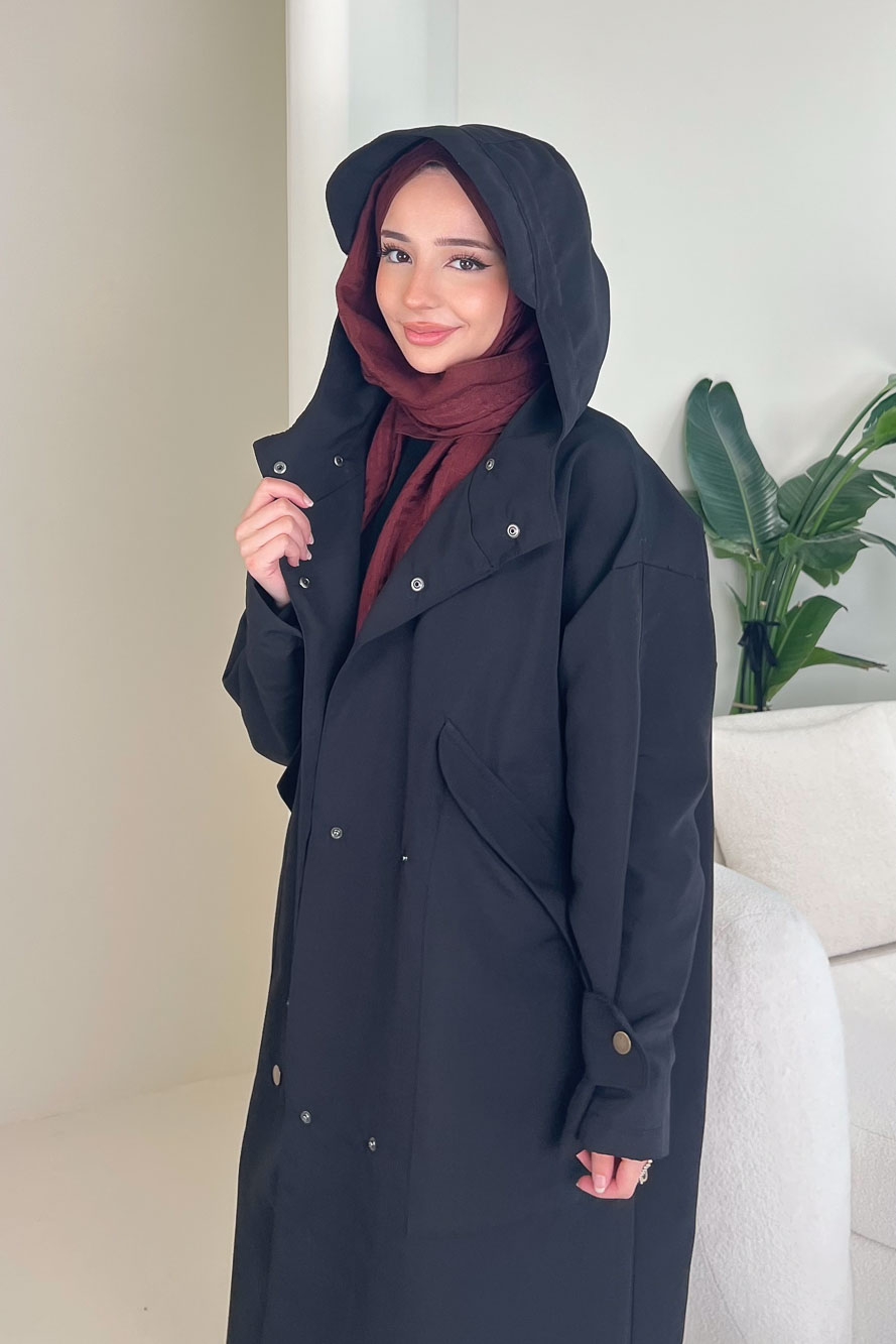 Woné Kapüşonlu Geniş Cepli Trençkot - Siyah