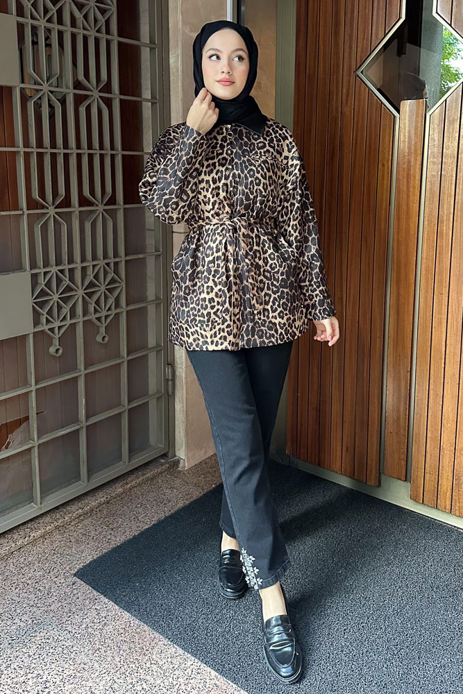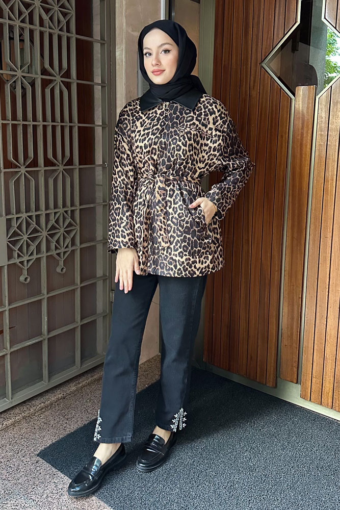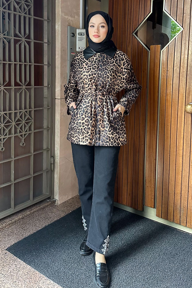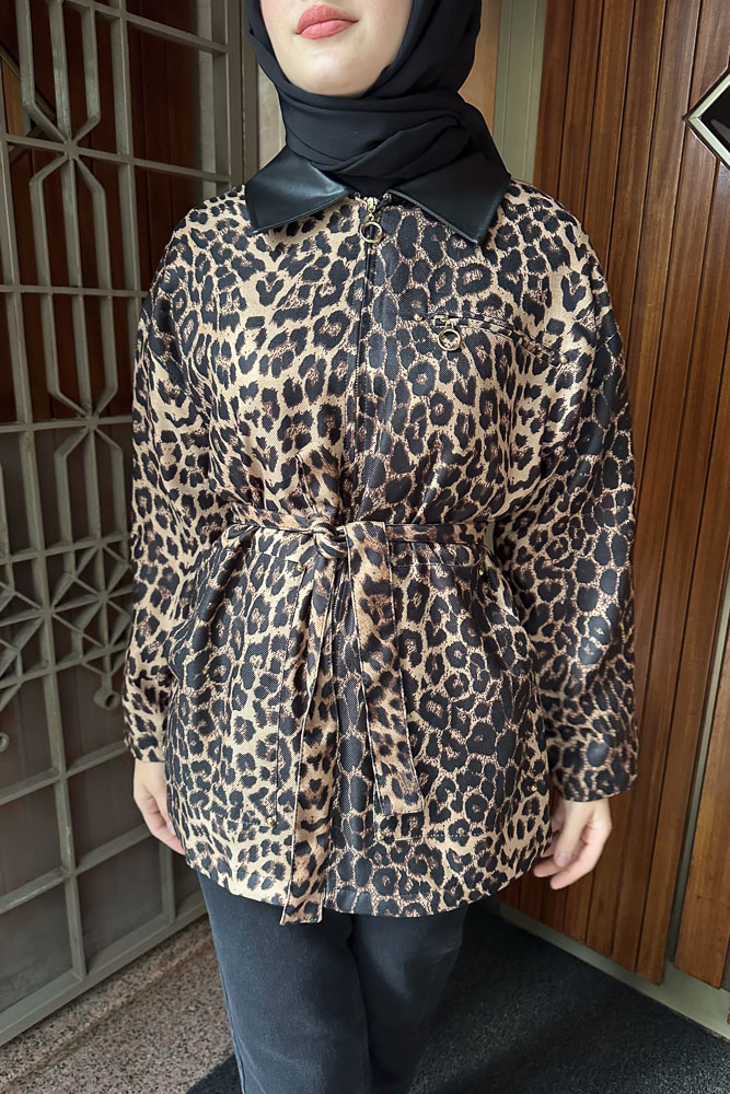 Yakası Deri Gizli Fermuarlı Leopar Ceket - Kahverengi