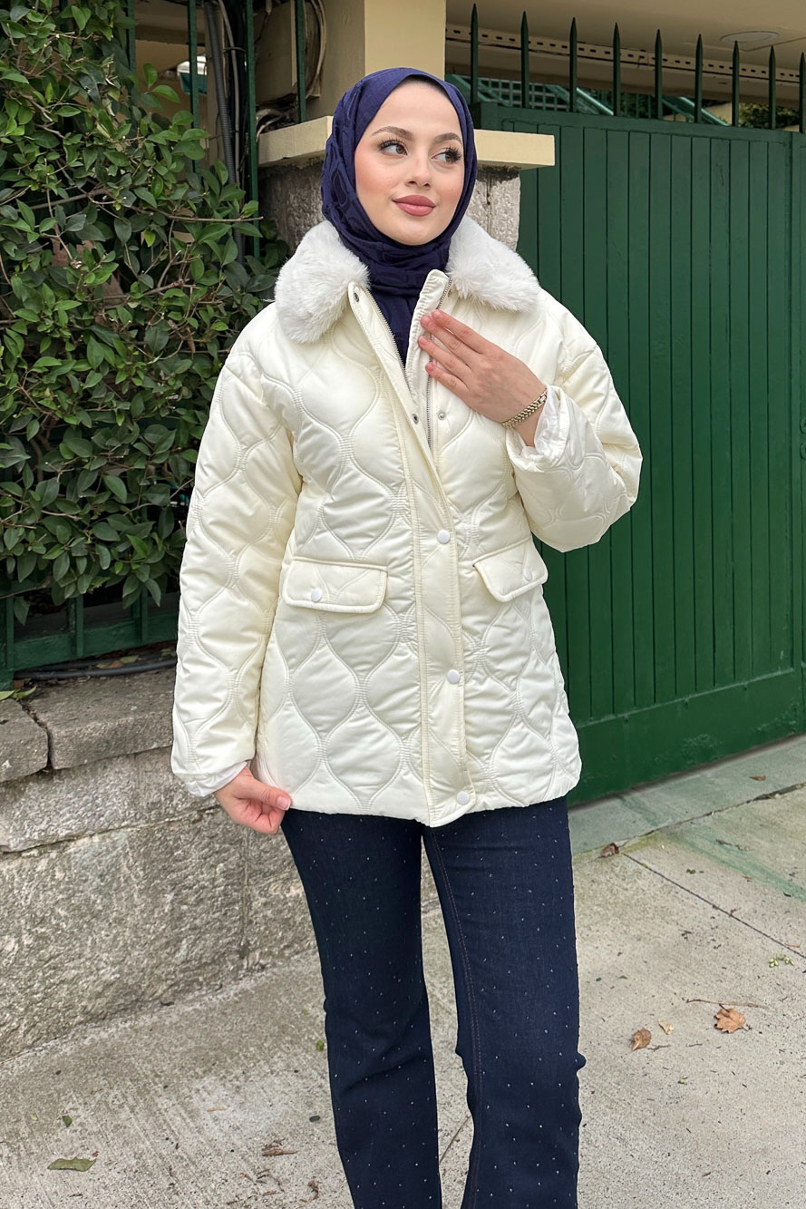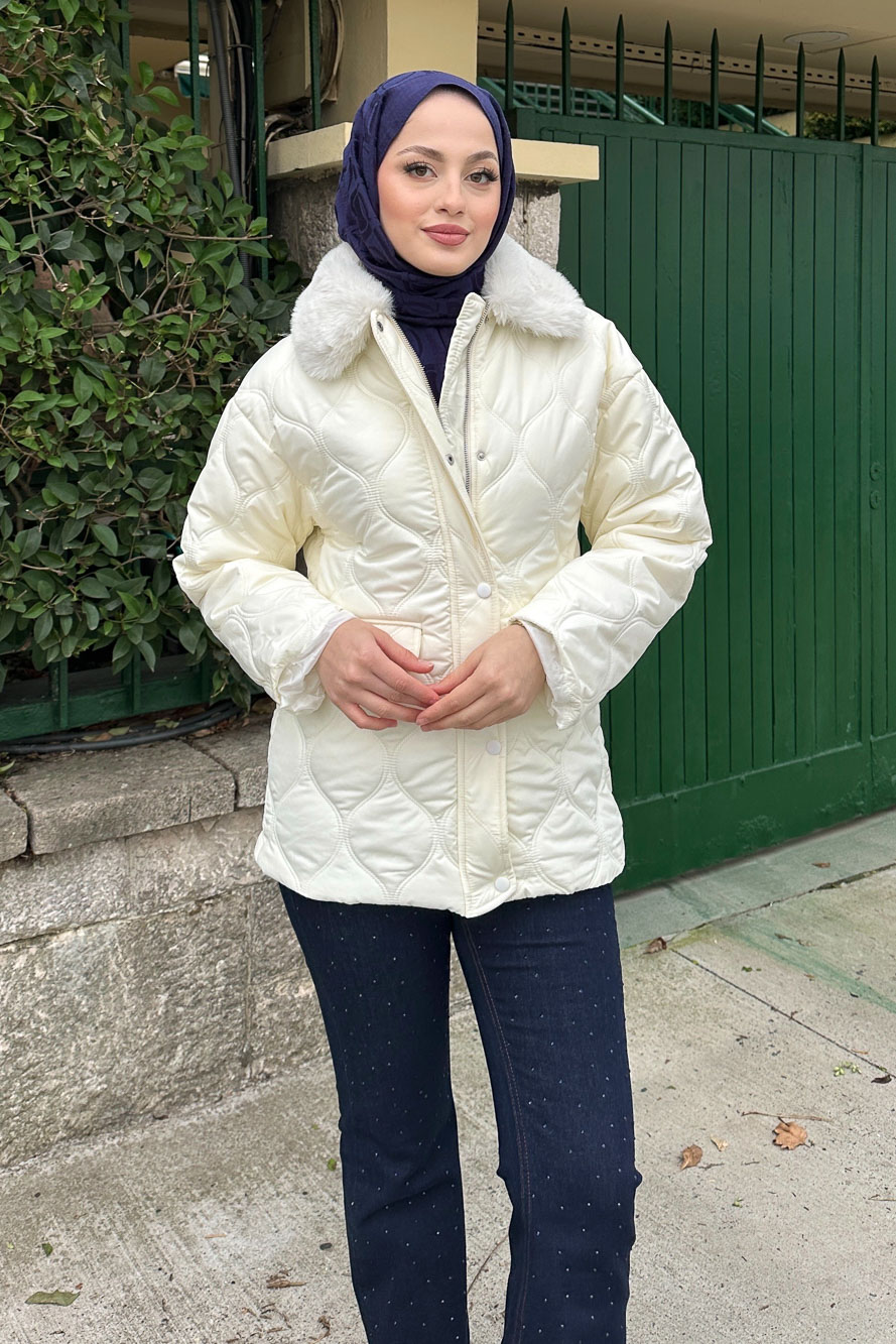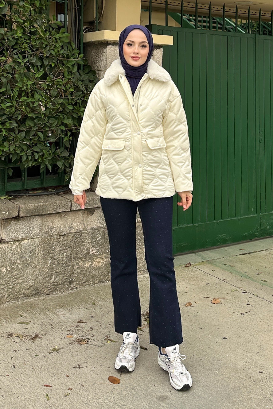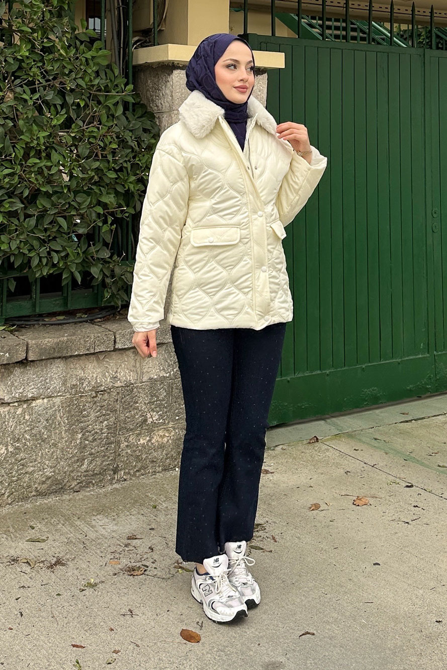Yakası Kürklü Mont - Ekru