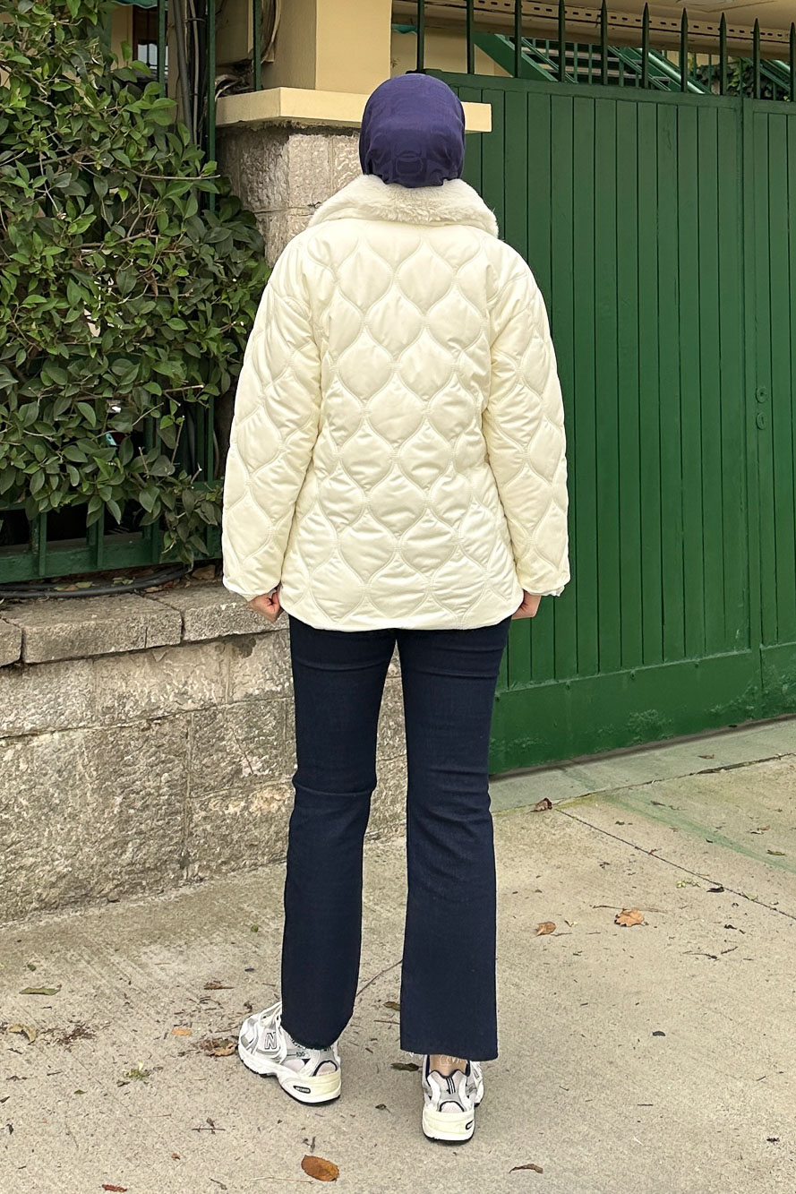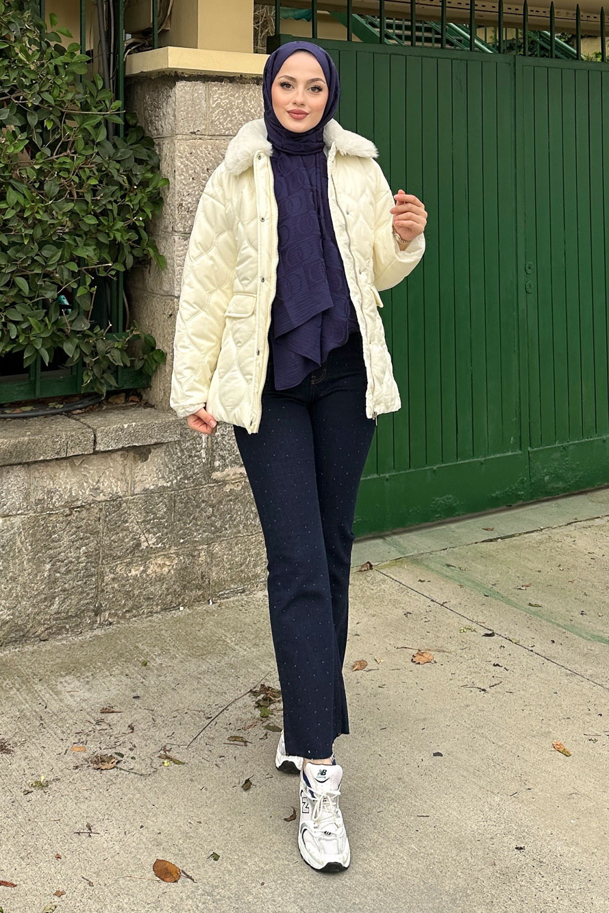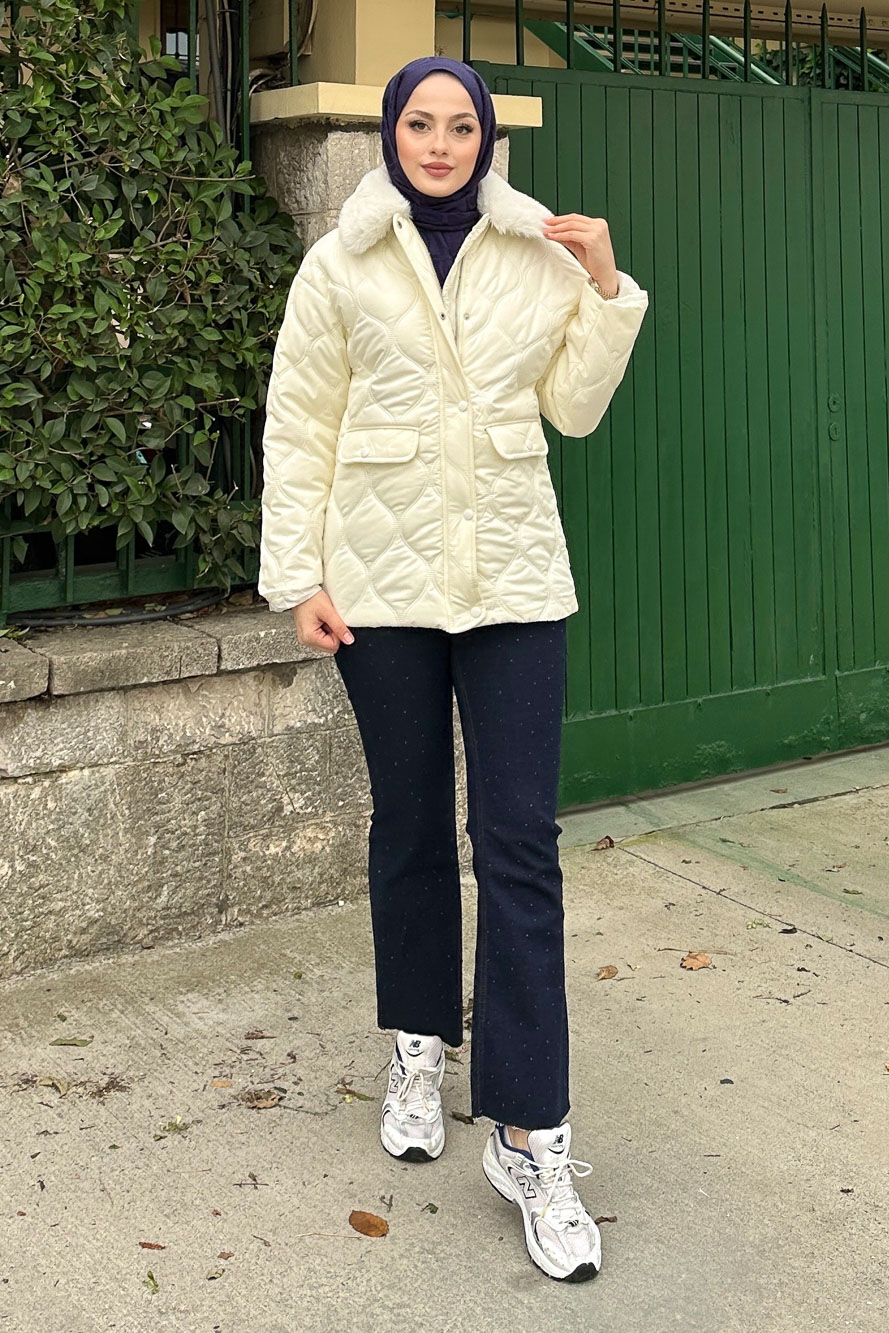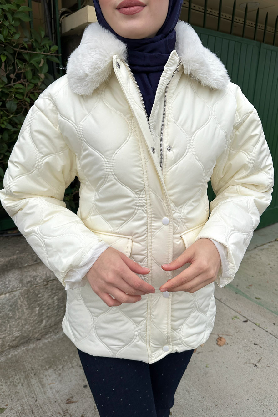 Yakası Kürklü Mont - Ekru