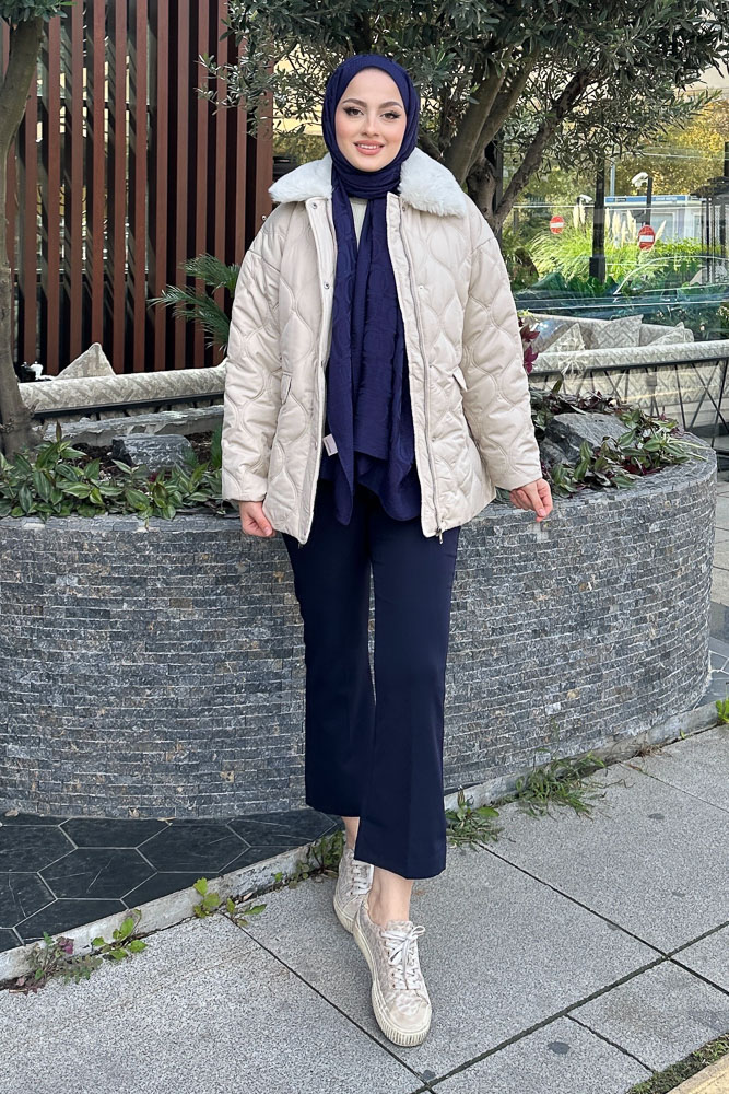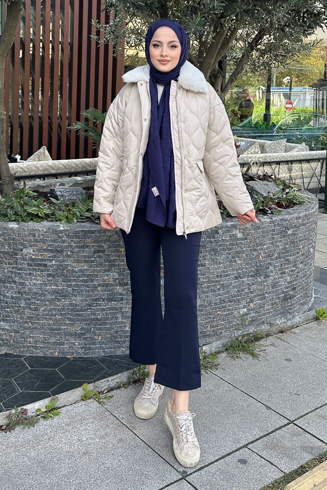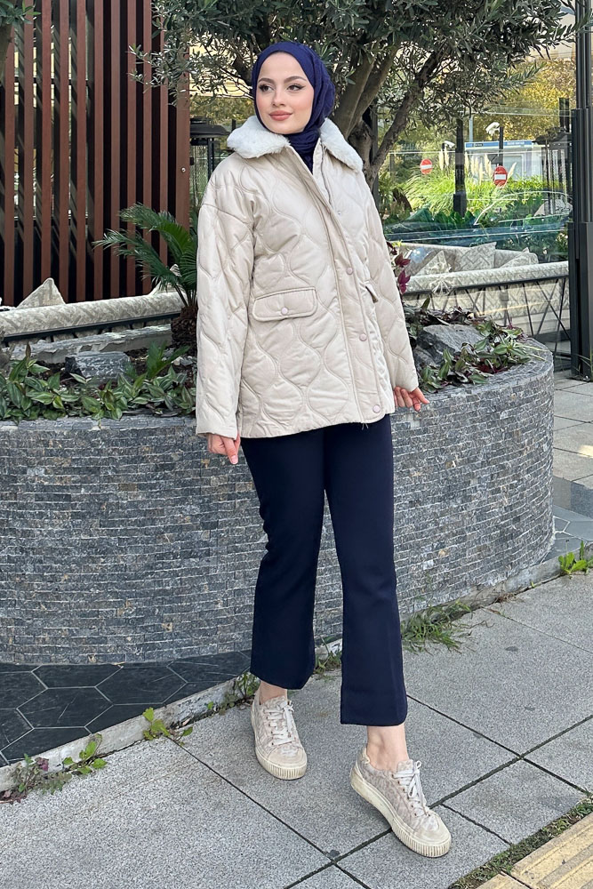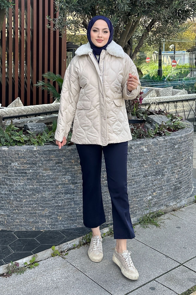 Yakası Kürklü Mont - Taş Rengi