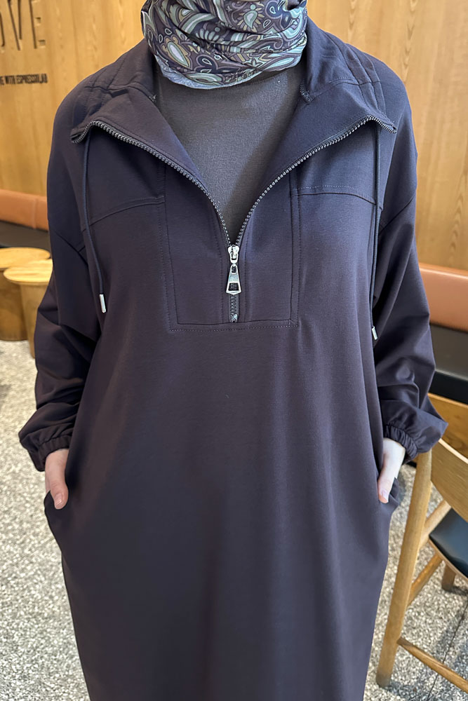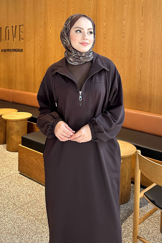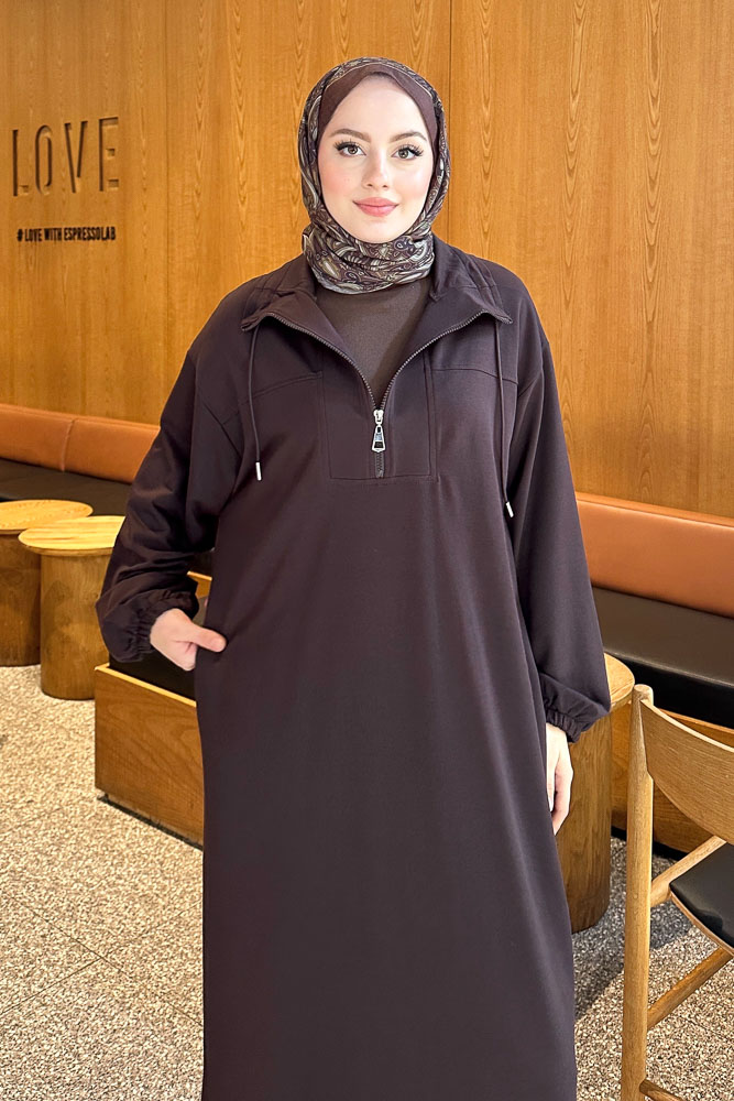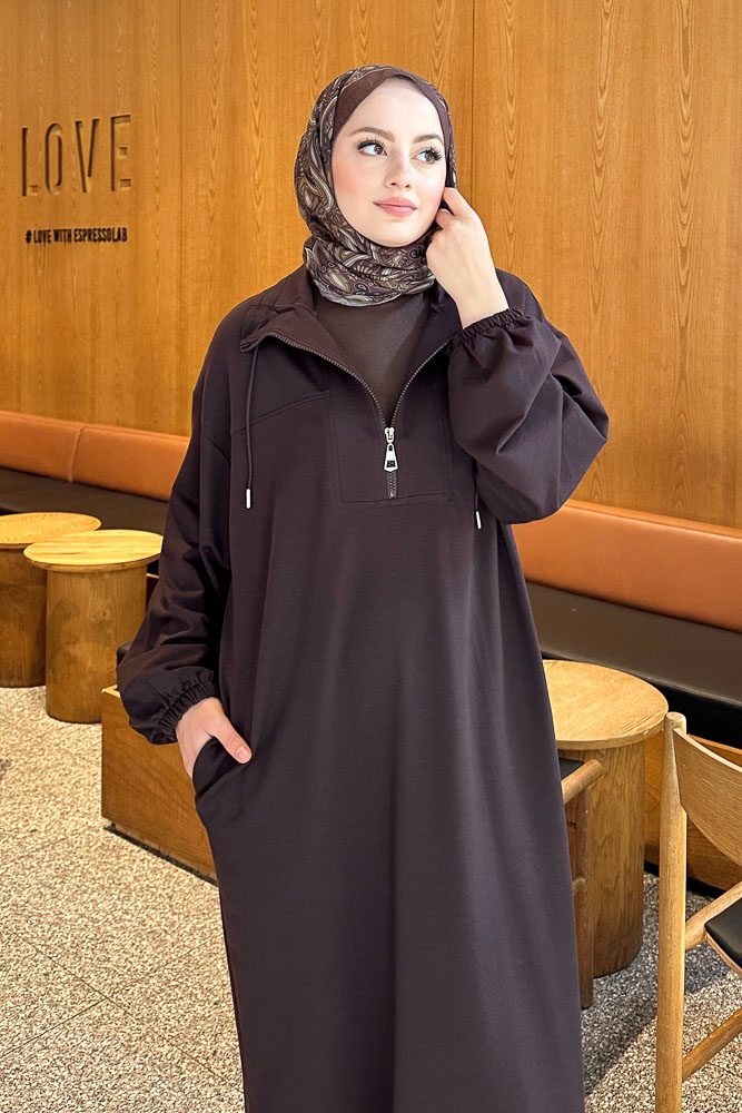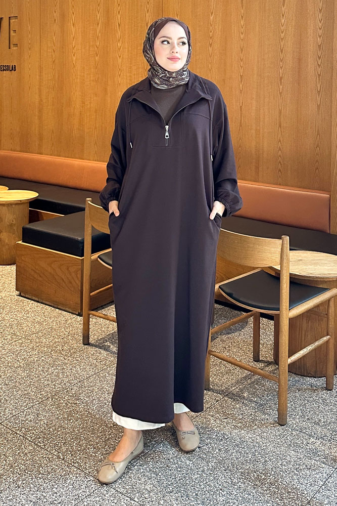 Yüksek Yaka Kesik Detaylı Elbise - Acı Kahve