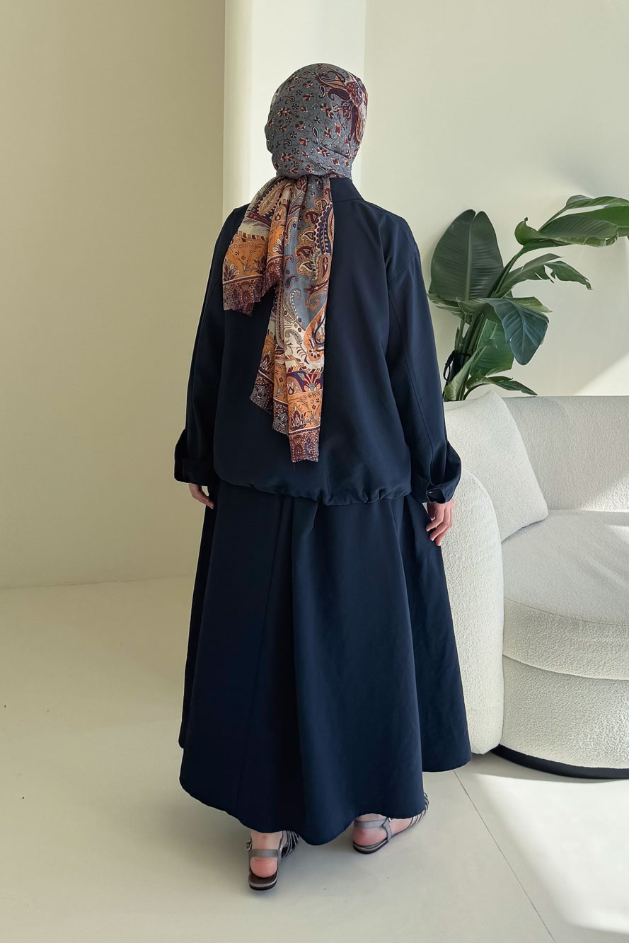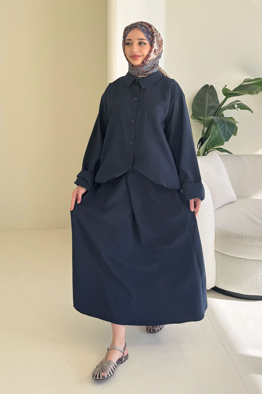 Üst kısmı cepli ve düğmeli tasarıma sahiptir. Bel kısmı stoper detaylıdır. Eteği cepli ve beli lastiklidir. Manken üzerinde S/M bedendir.